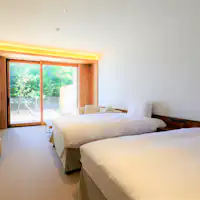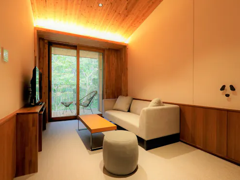 전 객실에 가케나가시 온천이 딸린 스위트 타입으로, 개방감 있는 실내에는 빈티지 가구를 배치해 럭셔리한 리조트 시간을 연출합니다. 반려견 동반이 가능한 레스토랑에서는 창작 일본 요리와 고슈 와인의 마리아주를 즐기실 수 있습니다.