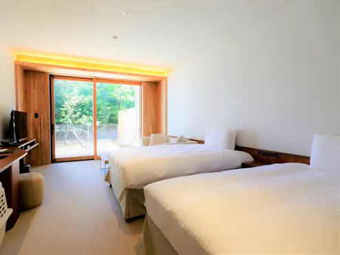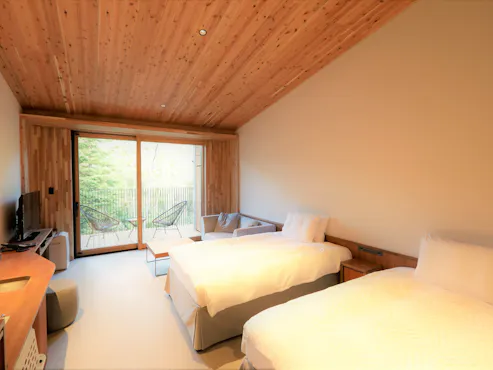가루이자와의 자연과 주변 환경에 조화를 이루며 자연과 하나 되는 감각을 느낄 수 있는 26개의 객실은 개방감 있고 세련된 분위기를 자랑합니다. 1층 객실에는 우드칩으로 조성된 프라이빗 도그런이 딸려 있으며, 2층 객실은 가루이자와 숲속에 머무는 듯한 분위기 속에서 넓은 테라스를 통해 맑은 공기를 만끽할 수 있도록 개방적으로 설계되어 있습니다.