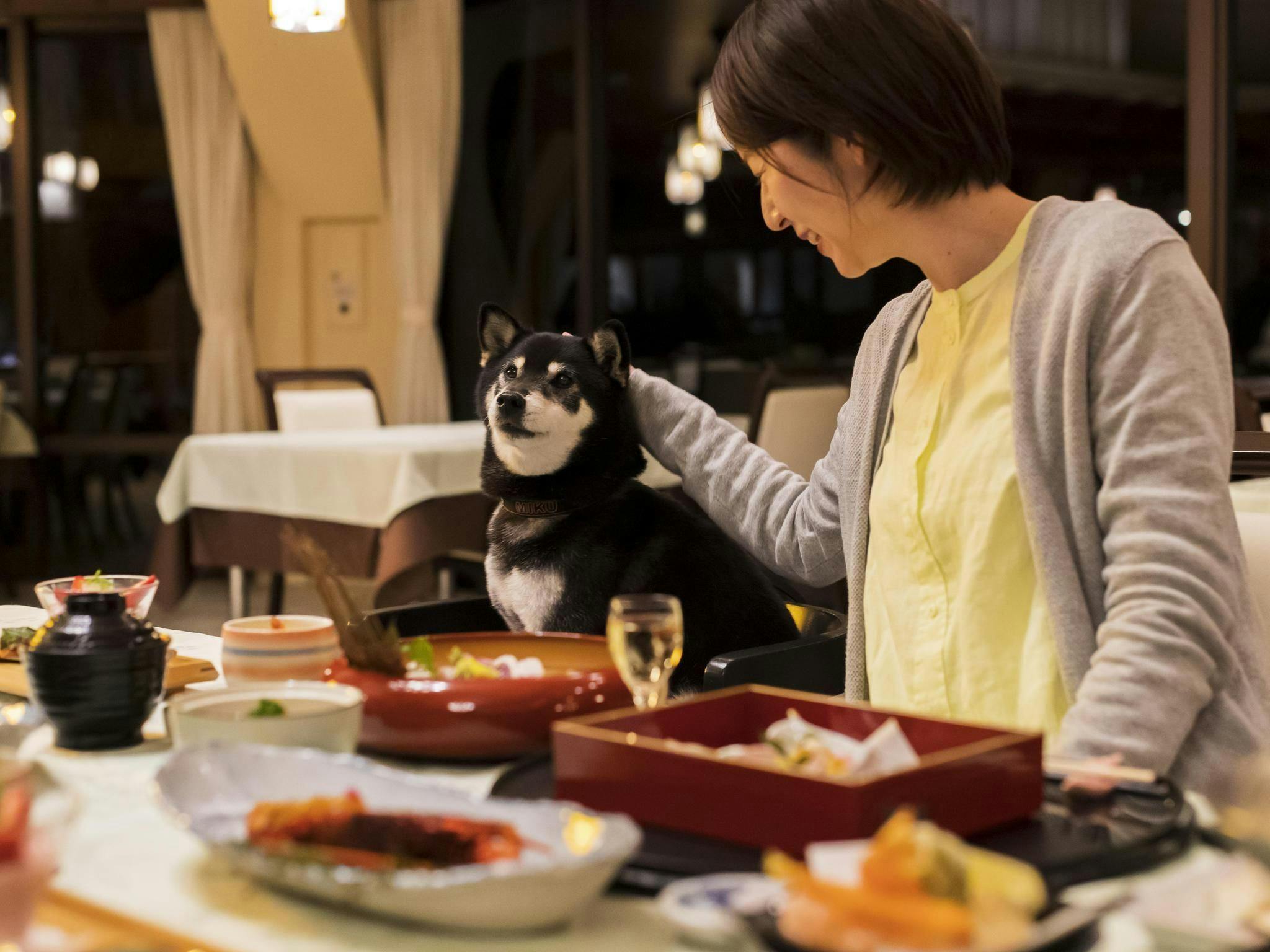이즈 사가미만의 제철 식재료로 만든 가이세키 요리를 마음껏 만끽해 보세요. 레스토랑에는 반려견과 함께 입장하실 수 있습니다.