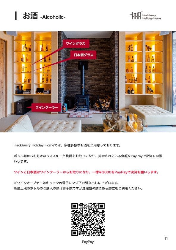 | 기타 | 숙소에서 결제는 PayPay만 가능합니다. 각종 술, 탄산수, 얼음 등을 구매하실 수 있습니다. 룸웨어는 초등학생 어린이와 여성은 M사이즈, 남성은 L사이즈를 준비하고 있습니다. 사이즈 변경을 원하시는 경우 댓글란에 기재해 주십시오. 텔레비전은 없습니다. 홈시어터가 침실에 있으며, 알라딘(popIn Aladdin)이 설치되어 있습니다. |