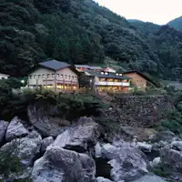 국도 33호선에서 한 걸음. 나카츠 계곡의 입구라고 할 수 있는 장소에 마을 내 원천을 끓인 온천 "나카츠 계곡 유노모리"가 있습니다. 건물은 숲의 환경에 맞춰 니요도가와 마을산 목조 건축으로 지어졌으며, 관내에도 숲의 향기가 감돌고 있습니다. 이 "나카츠 계곡 유노모리"는 느긋하게 온천을 즐길 수 있을 뿐만 아니라, 병설된 레스토랑에서 식사와 숙박 기능도 갖춘 편안한 시설입니다. 별이 보이는 노천탕. 객실은 편안한 일본식 방과 코티지(일본식 방 10다다미×4, 코티지 양실 트윈×3). 숙박자 전용 2층 레스토랑에서는 일본 요리를 준비. 당일치기 입욕·식사만도 가능합니다.