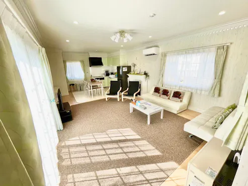 신슈 오이와케역에서 약 2.7km(차로 약 9분) 거리에 위치한 밝은 단층 아메리칸 하우스입니다. 아울렛에서 약 18분, 하루니레 테라스에서 약 10분, 가루이자와 고원 교회에서 약 10분, 슈퍼 델리시아, 슈퍼 츠루야에서 약 11분, 근처에 편의점도 있습니다. 액티브 리조트를 즐기시는 분도, 힐링 리조트를 원하시는 분도 즐길 수 있는 힐링과 럭셔리한 공간입니다. 최대 10명까지 숙박 가능합니다. (인접한 폴라 리조트 니시 가루이자와Ⅱ와 함께 최대 22명까지 숙박 가능합니다) 조신에츠도 우스이 가루이자와 IC, 사쿠 IC, 나가노 신칸센과 접근성이 좋으며, 근처에는 아울렛 몰이나 당일치기 온천, 세련된 카페 투어도 가능합니다. 저녁에는 주방에서 가루이자와 야채를 듬뿍 사용한 디너 타임을 즐기세요. 새들의 지저귐과 아침 햇살로 눈을 뜨는 아침. 여유롭게 늦잠을 즐긴 뒤의 브런치. 스크린의 얼룩처럼 아름다운 밤하늘의 별들. 번잡한 도시의 일상에서 벗어나 자연 속에서 마음이 치유되는 휴일을 만끽하실 수 있습니다. 소중한 사람과, 오랜 친구와 함께 느긋하고 힐링의 시간을 보내세요.