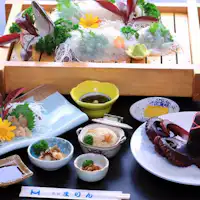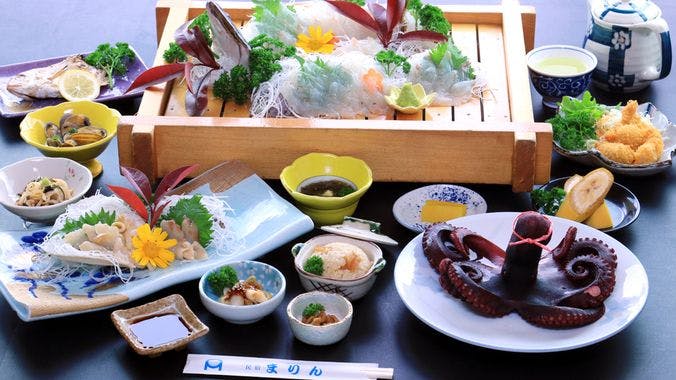 아이치현/치타군일간가섬의 높은 지대에 위치한 민박에서 "잠수 어업"으로 잡은 해산물을 사용한 요리를 만끽