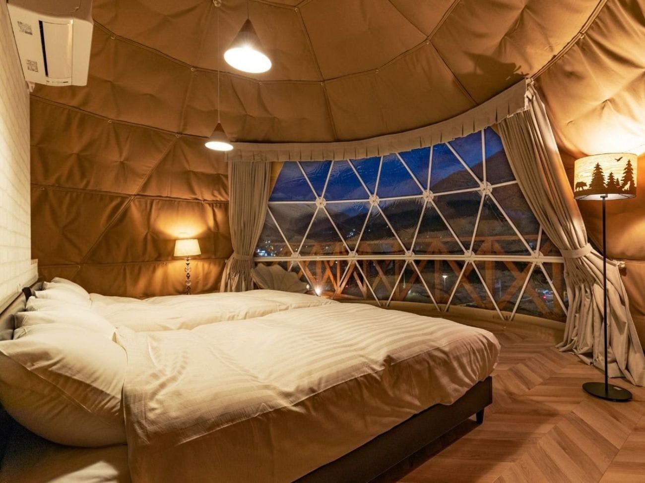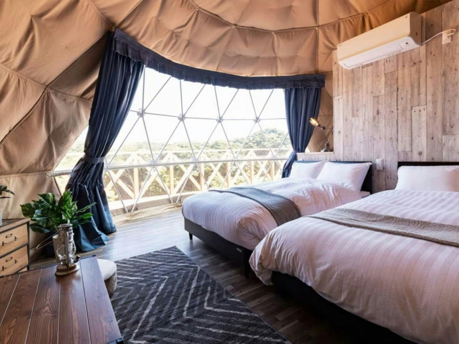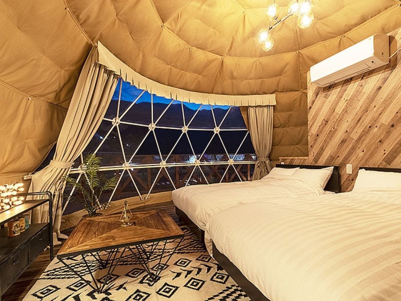반원형 대형 돔 텐트를 채용. 단열성이 높은 이중 구조의 실내는 전 객실 냉난방을 완비하여 사계절 내내 쾌적하게 지내실 수 있습니다. 전면의 투명 부분을 통해 벳푸의 자연이 풍부한 경치를 즐기실 수 있습니다. 객실 종류는 6타입이 있으며, 반려견과 함께 머무를 수 있는 객실도 3타입 준비되어 있습니다.
