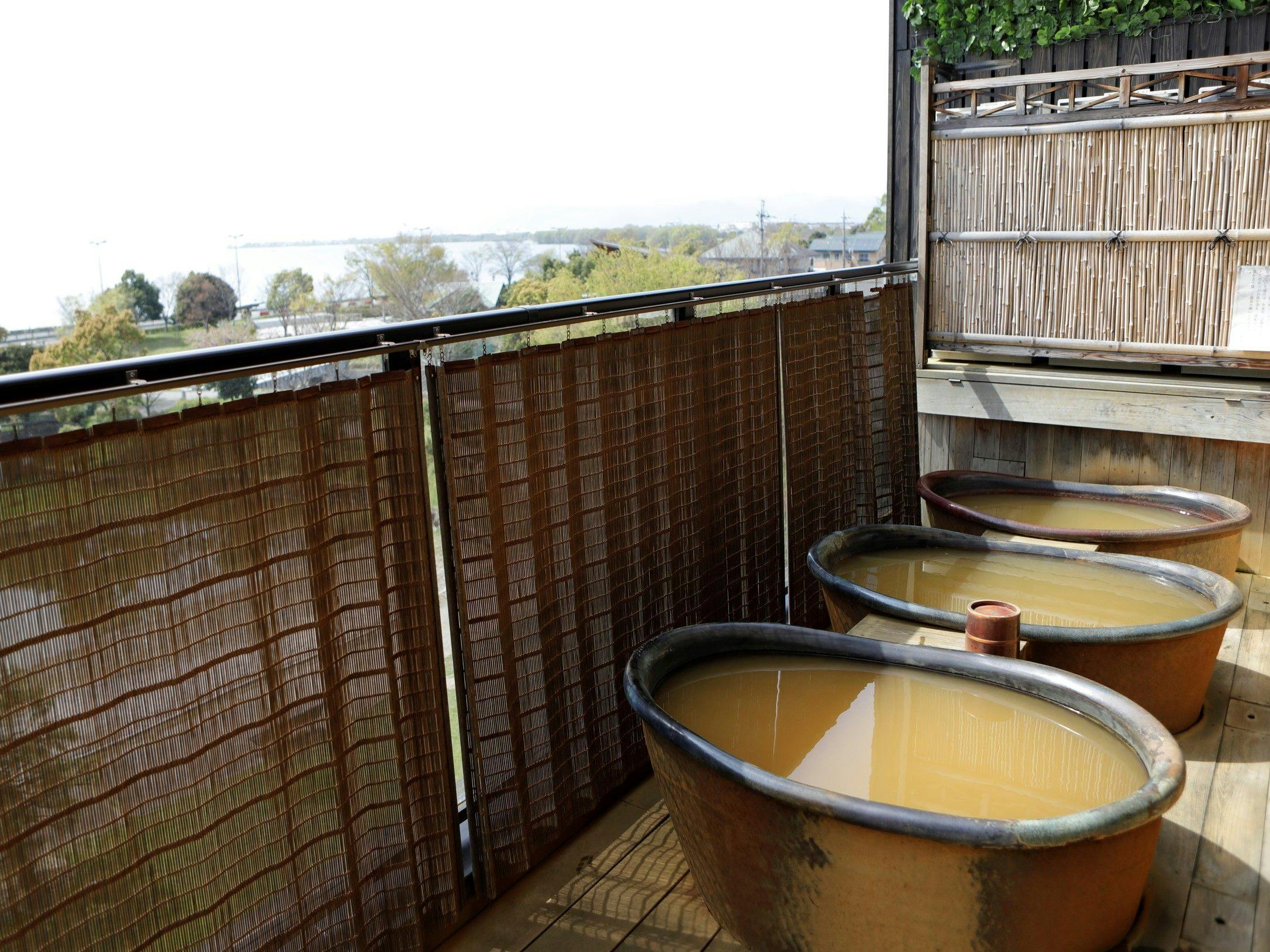Pemandian besar terbuka dengan mata air panas di Hamakogetsu yang bersebelahan hanya dipisahkan oleh koridor penghubung. Nikmati "Pemandangan Mata Air Panas Taiko" dengan pemandangan indah Tasik Biwa yang luas.