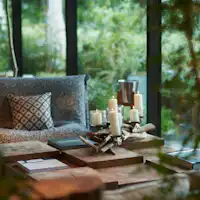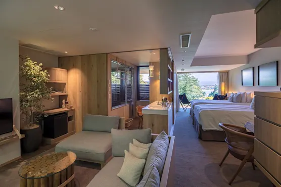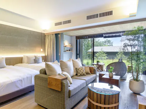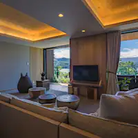 Resort mewah yang membuat anda seolah-olah berada di tengah alam semula jadi, dalam ruang tenang yang menghubungkan cahaya semula jadi dan nuansa Jepun, dengan batuan kukuh serta rumput dan bunga khas Hakone yang menambah kedalaman suasana.