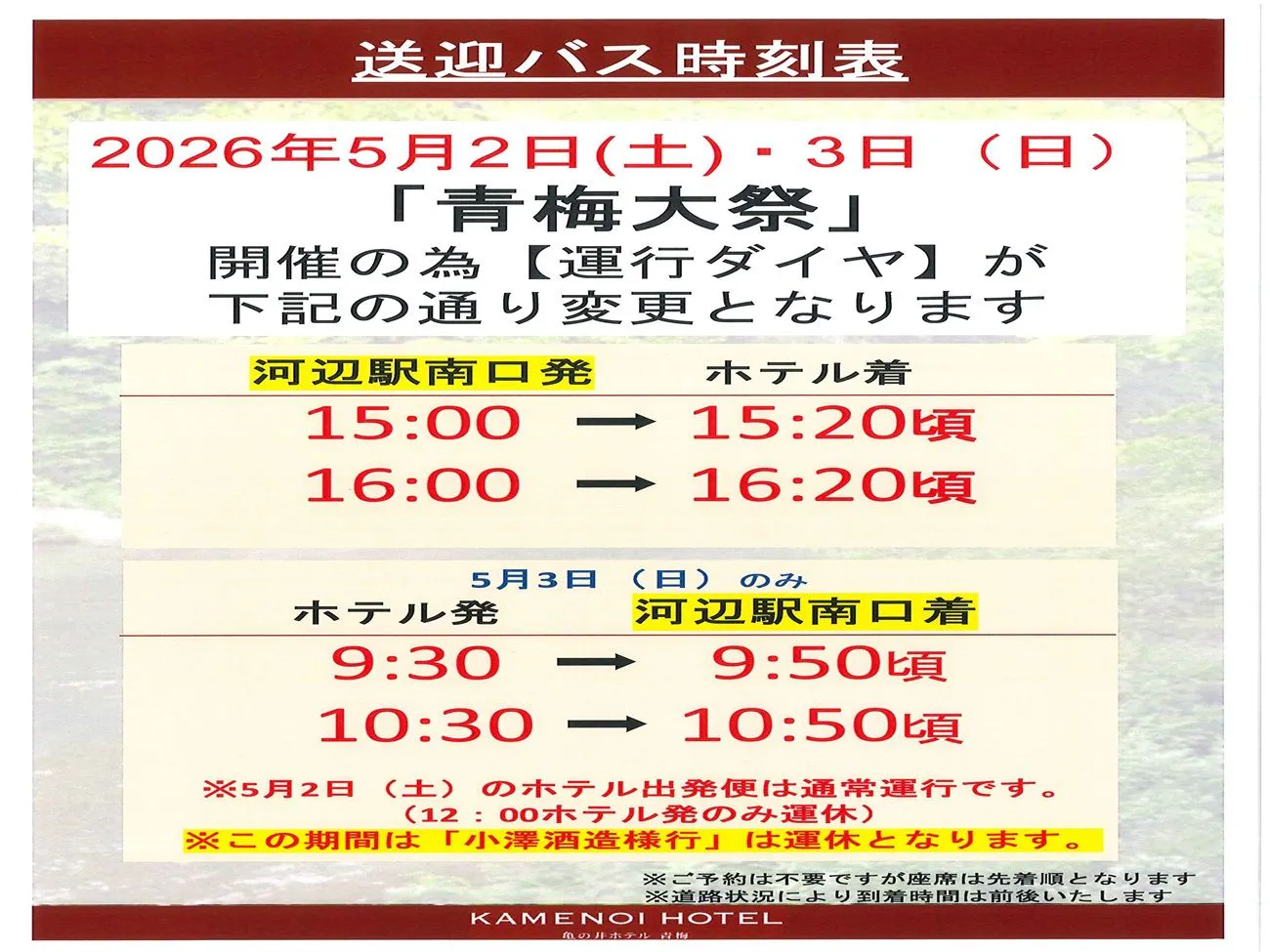 Pada 2 Mei (Sabtu) hingga 3 Mei (Ahad), kawasan sekitar Stesen Ome akan ditutup kepada lalu lintas sempena penganjuran Festival Besar Ome.
