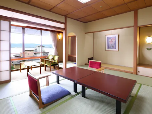 Ruang bergaya Jepun yang elegan, terletak tenang dengan pemandangan Tasik Suwa.