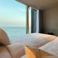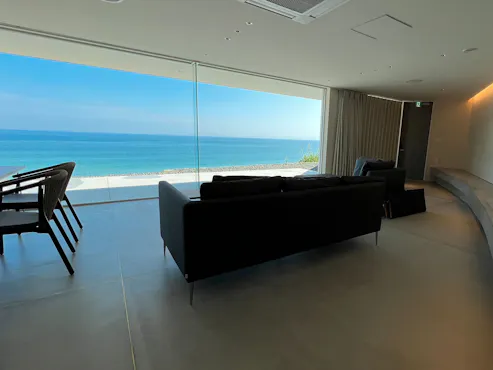 MUU menampilkan ciri khas dengan kaca besar dan teres yang luas. Reka bentuk dalaman diseragamkan dengan warna putih dan greige yang lembut, digabungkan dengan pemandangan laut biru yang memukau. Duduk di sofa sambil menikmati pemandangan ini pasti akan membuat anda terpesona...