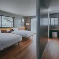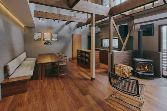 Ruang tamu dan ruang makan yang luas dengan pendiang api, direka dengan susun atur lapang untuk anda menikmati masa mengikut cara sendiri—penginapan istimewa yang hanya boleh dialami di sini. Ruang tamu dan ruang makan berkonsep siling tinggi ini menampilkan dalaman ringkas berasaskan tona kelabu yang harmoni dengan pemandangan alam. Sambil memandang nyalaan pendiang api kayu, anda boleh menikmati detik yang menenangkan. Bilik tidur yang terbuka menerima cahaya semula jadi yang lembut, manakala Mata air panas yang memancar dari bawah tanah membolehkan anda menikmati sumber air panas semula jadi hasil bumi Gunung Myoko dalam suasana tenang. Dari teres yang luas, nikmati keindahan alam mengikut musim; pada malam cerah, anda boleh berehat sambil menatap langit berbintang. Untuk aktiviti salji, tersedia bilik pengeringan serta rak khas peralatan salji di dalam garaj—Kemudahan lengkap untuk penggemar sukan musim sejuk agar dapat menginap dengan selesa dan yakin. Nikmati penginapan mewah satu bangunan eksklusif sepenuhnya ini, dengan kapasiti sehingga 7 orang—untuk pengalaman rehat dan pemulihan minda serta tubuh.