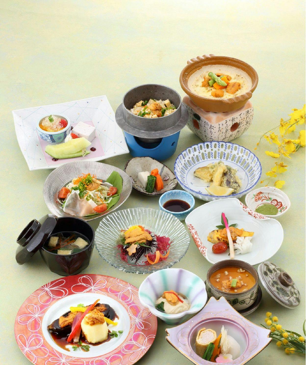 Kami menyediakan hidangan yang menggunakan hasil laut segar yang diperoleh dari pasar "Shiogama", salah satu pelabuhan perikanan terkemuka di Jepun, serta bahan-bahan bermusim.