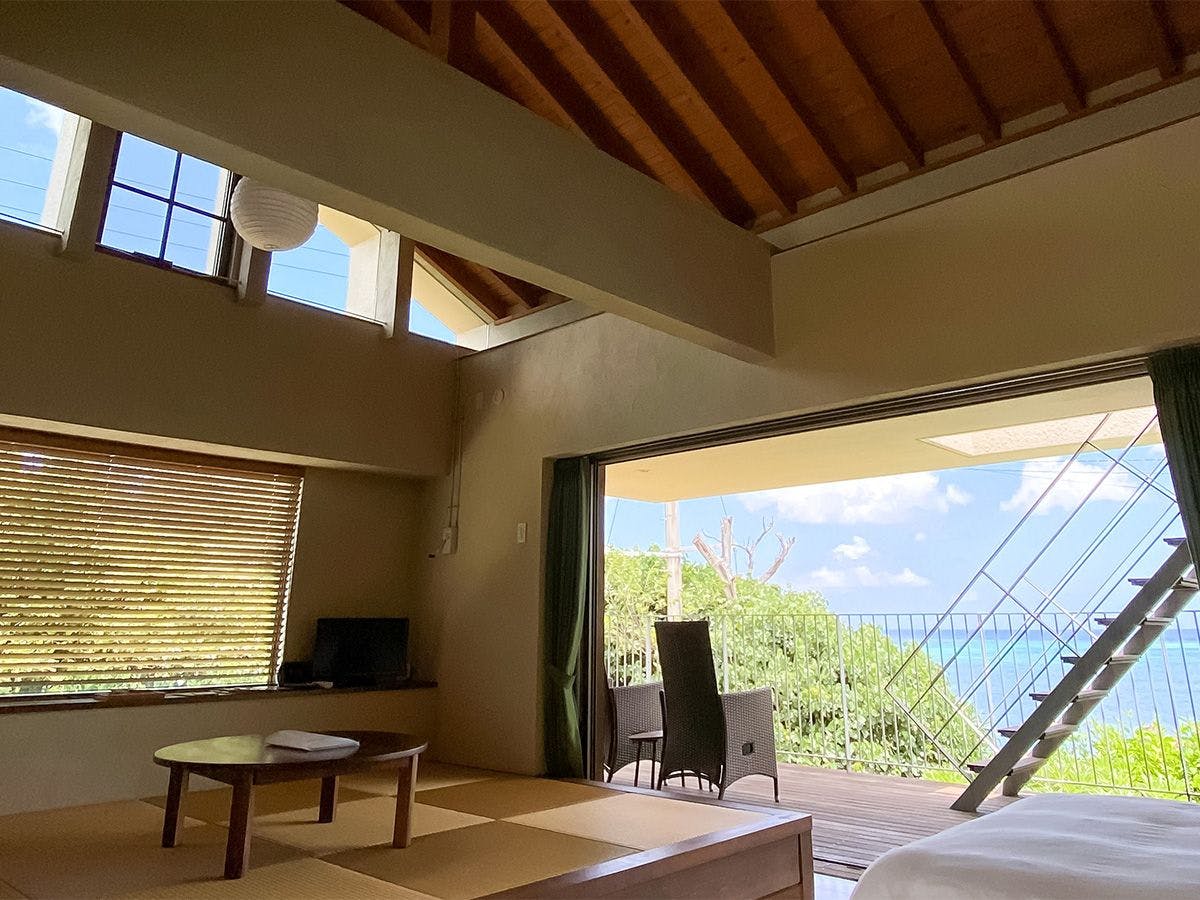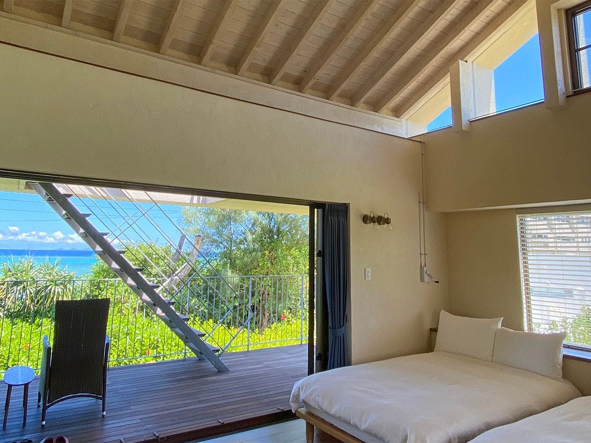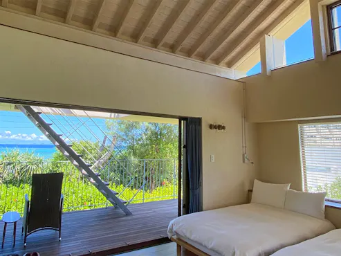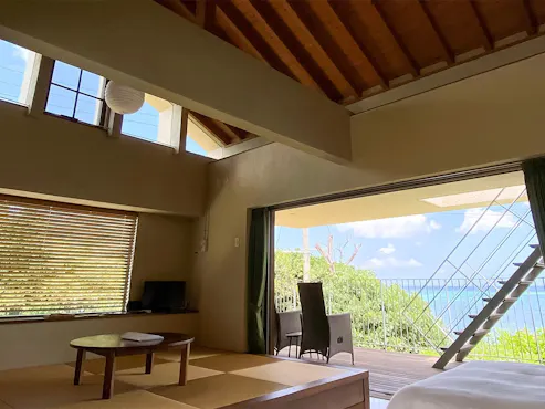 Teater Bintang dan Ombak Akabana Inn, menghadap laut biru Nakijin dan menatap langit berbintang yang berkilauan—nikmati saat bersantai dengan tenang.