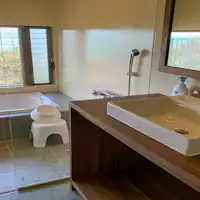 Di sebuah sudut kecil di kampung Imadomari, sebuah perkampungan tenang di Nakijin, sebuah kampung di utara Pulau Okinawa yang dikenali sebagai Yanbaru, terdapat sebuah Penginapan kecil bernama Akabana Inn yang hanya mempunyai dua Bilik. Terletak di kaki tapak warisan dunia Istana Nakijin, ia hanya 10 minit memandu ke Akuarium Churaumi, 25 minit memandu ke Pulau Kouri, dan lokasi yang mudah untuk ke kawasan Taman Negara Yanbaru. Hanya 30 saat berjalan kaki ke pantai di hadapan. Selain itu, terdapat banyak pantai semula jadi di dalam kampung. Pada musim panas, anda boleh mengelakkan panas dengan mendaki bukit kecil atau trekking di gunung Yanbaru. Pada musim sejuk, anda juga boleh menikmati aktiviti menonton paus dari Motobu, kampung jiran. Jika bernasib baik, anda mungkin dapat melihat paus di laut di hadapan. Selepas aktiviti di alam semula jadi, anda boleh berehat di Bilik sambil mendengar bunyi ombak. Bilik yang disediakan untuk penginapan anda adalah Green Room, yang boleh memuatkan sehingga 4 orang dengan ruang tatami Ryukyu, dan Blue Room, yang boleh memuatkan sehingga 3 orang. Kedua-duanya adalah Bilik di tingkat dua dengan dinding plaster, siling tinggi, dan pemandangan laut. Apabila tingkap dibuka sepenuhnya, dek luar yang luas menjadi sebahagian daripada Bilik. Pemandangan dari kerusi rehat di dek luar adalah yang terbaik. Dari dek luar, anda boleh menaiki tangga ke Stardust Deck, di mana anda boleh menikmati pemandangan langit malam yang dipenuhi bintang. Di piloti tingkat satu, anda boleh menikmati BBQ, membaca buku atau tidur siang di buaian sambil mendengar bunyi ombak. Selepas kembali dari laut, anda boleh menggunakan pancuran dan tempat mencuci tangan di luar. Mesin basuh dan pengering juga disediakan. Terdapat juga loker untuk menyimpan wetsuit, peralatan marin, dan alat permainan. Luangkan masa anda menikmati masa Okinawa yang santai di Akabana Inn, teater bintang dan ombak.