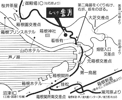【กรณีเดินทางโดยรถไฟชินคันเซ็น】 โตเกียว → โอดาวาระ (35 นาที) โคดามะ นาโกย่า → มิชิมะ (1 ชั่วโมง 15 นาที) ฮิคาริ ชินโอซาก้า → มิชิมะ (2 ชั่วโมง 15 นาที) ฮิคาริ ※จากโอดาวาระหรือมิชิมะ ใช้เวลา 30 นาทีโดยแท็กซี่ 【กรณีเดินทางโดยรถไฟโอดะคิวโรแมนซ์คาร์】 ชินจูกุ → ฮาโกเนะยูโมโตะ (90 นาที) ※จากฮาโกเนะยูโมโตะ ใช้เวลา 20 นาทีโดยแท็กซี่ 【กรณีเดินทางโดยรถยนต์ (ทางด่วนโทเม)】 อัตสึกิ IC → ถนนโอดาวาระ-อัตสึกิ → โมโตฮาโกเนะ (50 นาที) โกเท็มบะ IC → โอโตเมะโทเกะ → เซนโกคุฮาระ → โคจิริ → โมโตฮาโกเนะ (40 นาที) นุมะซุ IC → มิชิมะ → ฮาโกเนะโทเกะ → โมโตฮาโกเนะ (40 นาที) 【กรณีเดินทางโดยรถบัส】 ลงที่ป้ายรถบัส "โมโตฮาโกเนะ" หรือ "ท่าเรือโมโตฮาโกเนะ" มีบริการรับส่งฟรี 【กรณีเดินทางโดยเรือ】 ลงเรือที่ "โมโตฮาโกเนะ" "ฮาโกเนะมาจิ" "ซากิโชฮาโกเนะ" หรือ "ฮาโกเนะเอ็น" มีบริการรับส่งฟรี
