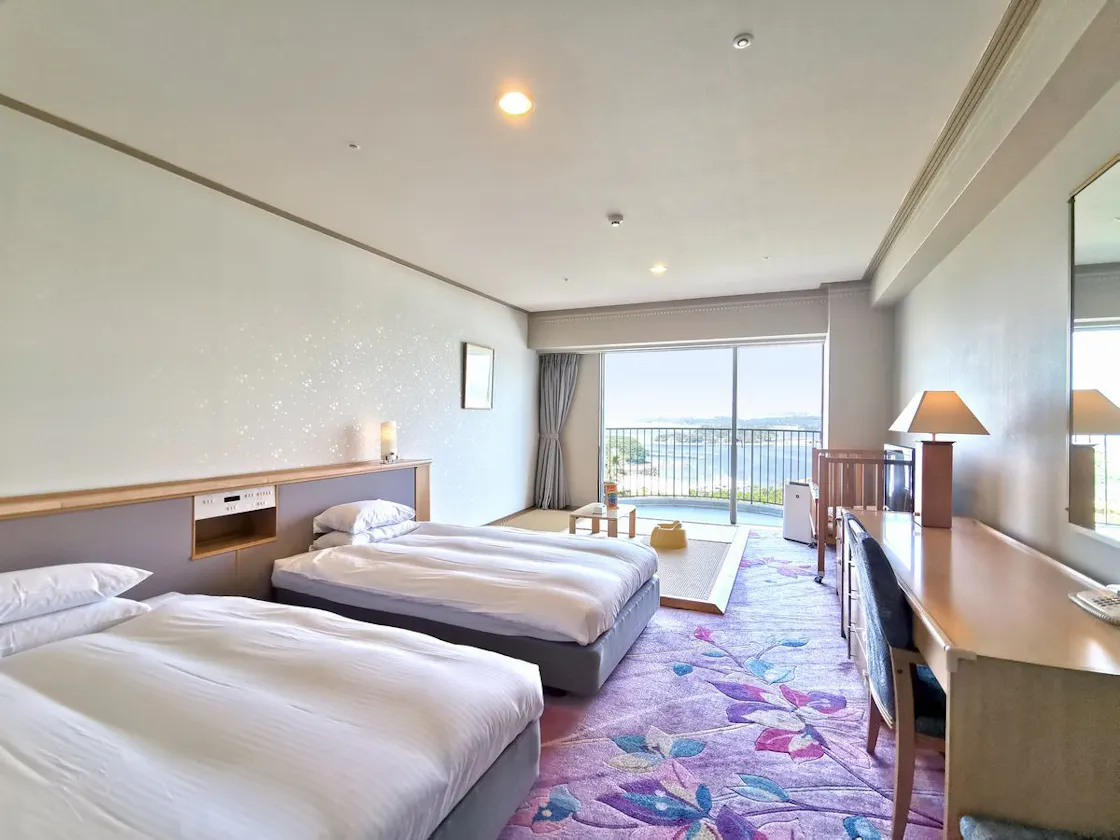 ห้องพักขนาด 45 ตารางเมตร พร้อมพื้นที่เสื่อทาทามิ (สำหรับผู้เข้าพักสูงสุด 4 ท่าน) มีเตียงกึ่งดับเบิ้ลขนาดใหญ่ 2 เตียง และสามารถปูฟูก 2 ชุดบนพื้นที่เสื่อทาทามิได้ สามารถเลื่อนเตียงมาติดกันเพื่อใช้งานได้ ・สิ่งของที่อาจเป็นอันตรายต่อทารกถูกติดตั้งในที่สูง ・เฟอร์นิเจอร์มีการติดตั้งมุมยางยูรีเทนเพื่อความปลอดภัย เด็กสามารถเดินเล่นได้อย่างสบายใจ ・มีเครื่องเล่น DVD พร้อมใช้งาน เด็กๆ จะไม่รู้สึกเบื่อ มีห้องอาบน้ำและห้องสุขาในตัว ※ห้องพักนี้เป็นห้องปลอดบุหรี่