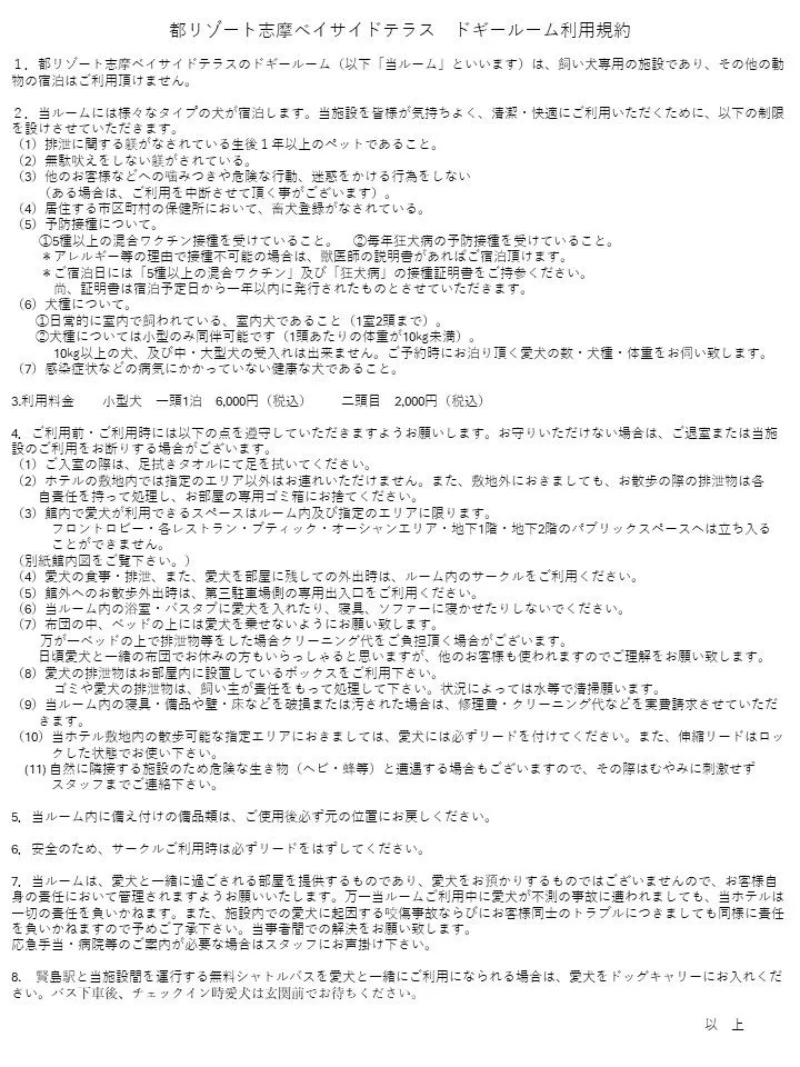 (รถไฟ) หากใช้บริการรถบัสรับส่งจากสถานี Kashikojima กรุณาใส่สุนัขของท่านในกระเป๋าสำหรับสัตว์เลี้ยง หลังลงจากรถบัส กรุณารอพร้อมกับสุนัขของท่านหน้าทางเข้าขณะทำการเช็คอิน