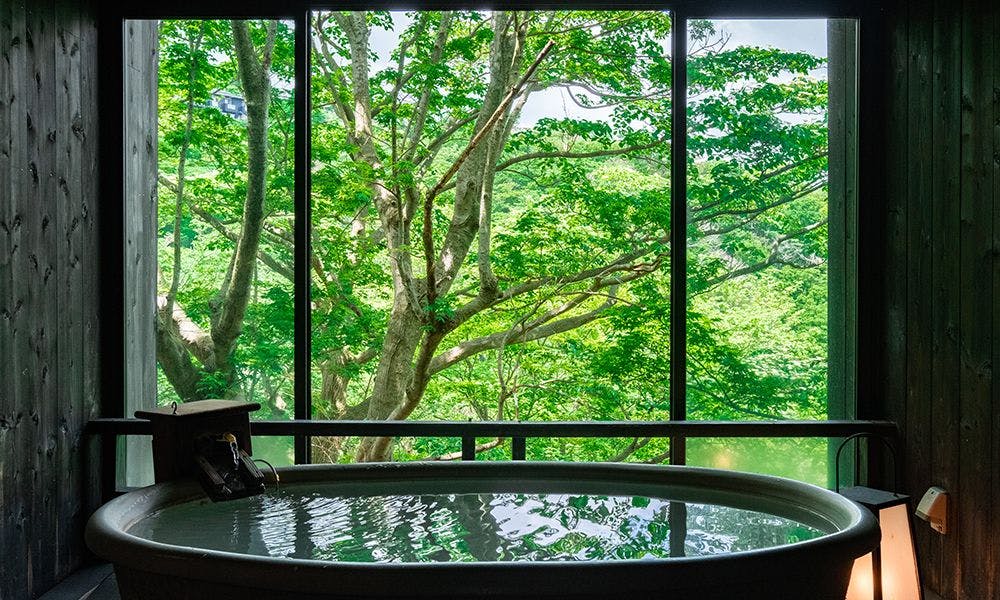 เพลิดเพลินกับการแช่น้ำร้อนพร้อมสัมผัสการเปลี่ยนแปลงของฤดูกาลทั้งสี่ เราได้จัดเตรียมห้องพักส่วนตัวสำหรับแช่น้ำร้อนกลางแจ้งไว้ให้คุณในสถานที่ที่มีทิวทัศน์ที่ดีที่สุดในพื้นที่ประมาณ 2200 สึโบะ หรือในป่า ซึ่งมีบรรยากาศที่แตกต่างจากห้องพักของคุณอย่างสิ้นเชิง นอกจากนี้ คุณยังสามารถสั่งแชมเปญหรือเบียร์ผ่านโทรศัพท์ภายในได้ มีหน้าต่างเล็ก ๆ สำหรับรับของโดยไม่ต้องพบหน้ากัน
