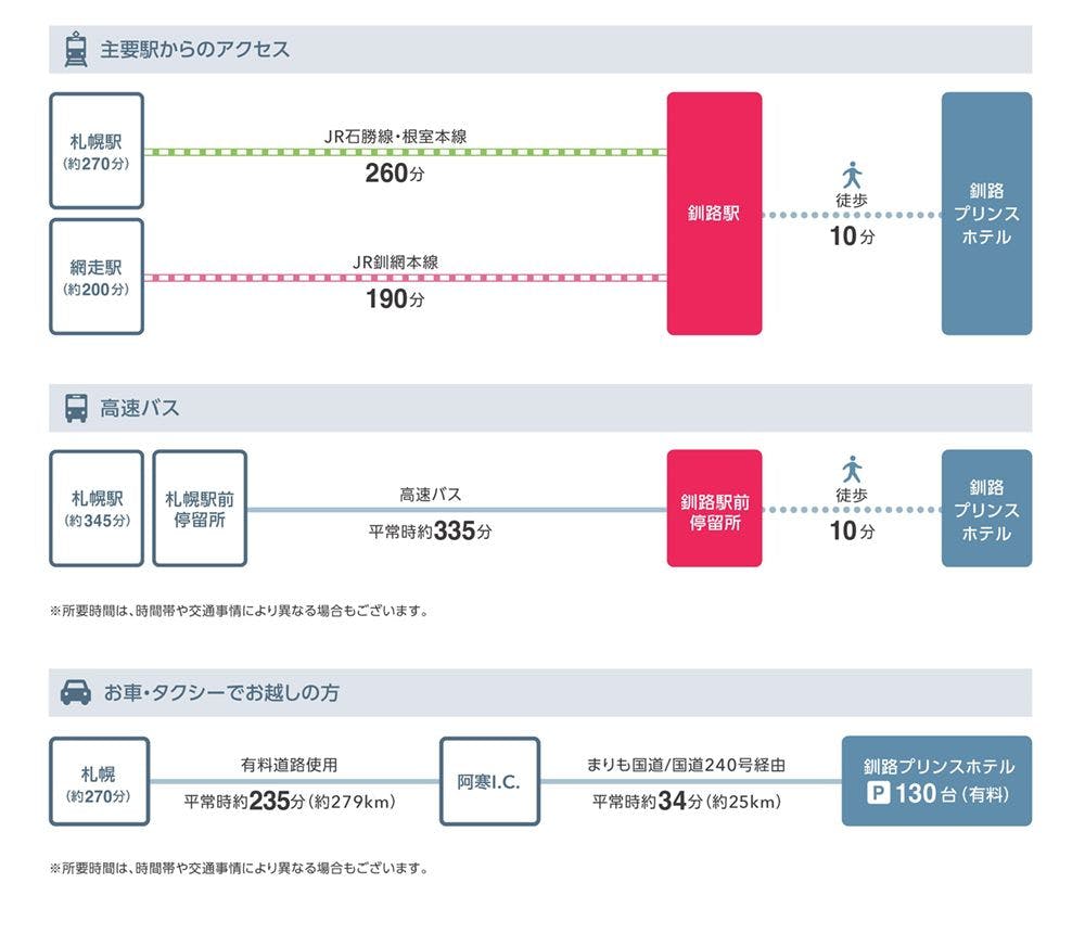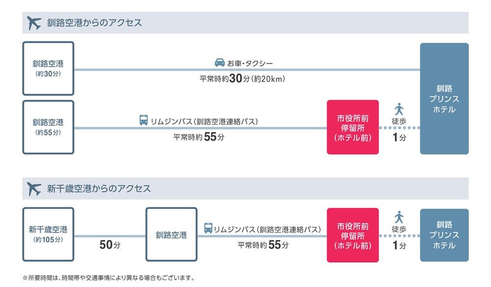 ○รถยนต์ จากสนามบินคุชิโระ นั่งแท็กซี่ประมาณ 40 นาที (สภาพการจราจรปกติ) ○รถไฟ จากสถานีคุชิโระ สายเนมุโระ นั่งแท็กซี่ประมาณ 3 นาที (สภาพการจราจรปกติ) หรือเดิน 10 นาที ○เครื่องบิน จากสนามบินฮาเนดะถึงสนามบินคุชิโระ 1 ชั่วโมง 35 นาที จากสนามบินนิวชิโตเสะถึงสนามบินคุชิโระ 40 นาที จากสนามบินคุชิโระถึงหน้าคุชิโระ พรินซ์ โรงแรม (หน้าศาลาว่าการเมืองคุชิโระ) โดยรถบัส 55 นาที