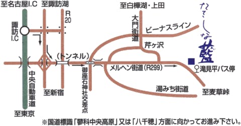 ・โตเกียว (ทางด่วนชูโอ) ~ ซูวะ I.C ~ ถนนเทพนิยาย (R229) ~ ที่พัก ทาเทชินะไอ (ประมาณ 30 นาทีจากซูวะ I.C)