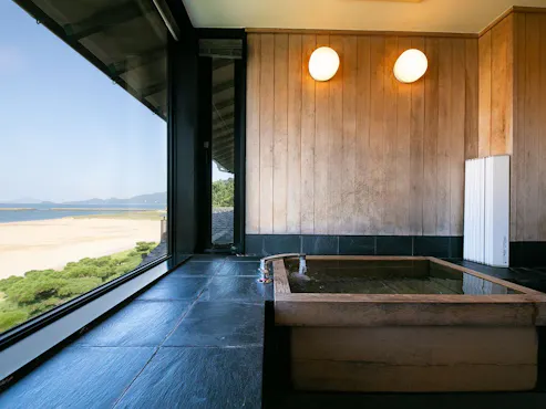 สถาปัตยกรรมแบบญี่ปุ่นดั้งเดิม Sukiya ที่เงียบสงบและผ่อนคลาย ทุกห้องสามารถมองเห็นทะเลได้ ทางเหนือมีทะเล Genkai และทางตะวันออกมีปราสาท Karatsu คุณสามารถเพลิดเพลินกับอาหารปลาสดใหม่ในบรรยากาศเหมือนเจ้านาย
