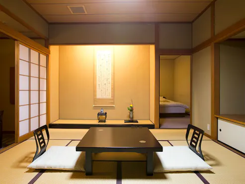 สำหรับผู้เข้าพักไม่เกิน 2 ท่าน จะจัดเตรียมอาหารใน "ห้องพัก" หรือ "ห้องรับประทานอาหารส่วนตัว" และสำหรับ 3 ท่านขึ้นไป จะจัดเตรียมอาหารใน "ห้องรับประทานอาหารส่วนตัว" เท่านั้น ※ สำหรับอาหารไคเซกิที่มีปูและเนื้อวากิว เพื่อป้องกันกลิ่นอาหารในห้องพัก อาหารจะถูกจัดเตรียมในห้องรับประทานอาหารส่วนตัวไม่ว่าจะมีกี่ท่านก็ตาม