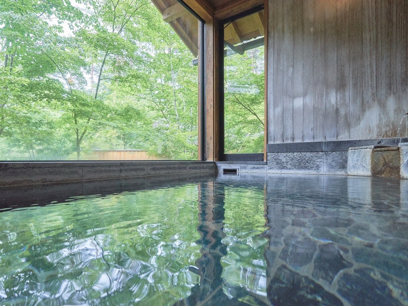 เดินผ่านทางเดินที่มองเห็นวิวไปยังห้องอาบน้ำแต่ละห้อง เสียงน้ำที่ก้องกังวานในความเงียบ เงาของนกที่มองเห็นในระยะไกล สัมผัสฤดูกาลบนผิวของคุณ เมื่อแช่ตัวในน้ำพุร้อนที่ผุดขึ้นจากเชิงเขาแอลป์ จิตใจและร่างกายของคุณจะถูกนำไปสู่ความรู้สึกผ่อนคลาย