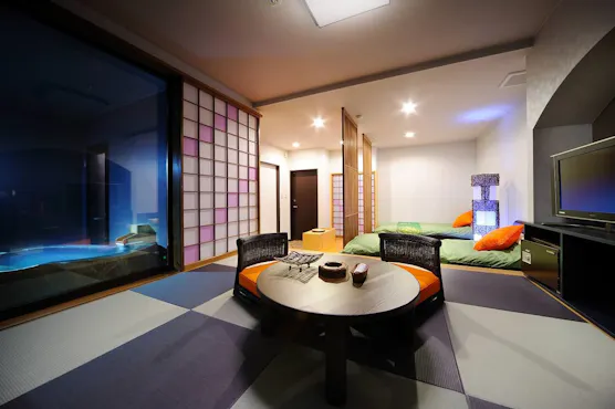 バイク旅 14/2/2026This was our first time staying for a birthday celebration with an anniversary plan. Upon entering the room, we found a heart-shaped bath towel arranged on the futon. At dinner, there was a "kusudama" at the dining area, and when we pulled it, it said "Congratulations!" A banner reading "HAPPY BIRTHDAY to you" was also displayed on the window next to our table—what a surprise! We were given a bottle of champagne and told, "Please wait in the lounge after your meal." While waiting, they brought out dessert with fireworks on the cake and said, "Please look outside." When we looked out the window, fireworks lit up the sky! The food matched our tastes perfectly; even the milk was easy to drink. The timing between dishes was just right, making everything very delicious. However, we noticed that the sofa bed in our room creaked slightly. Since it was listed as a Japanese-Western style room (和洋室), having beds instead of futons would make getting up easier. From our room's open-air bath (露天風呂), we enjoyed views of autumn pampas grass swaying in the breeze. One concern: before reaching the women’s open-air bath in the large public bath area (大浴場), there is a shower area where people wash. If someone is there using it, it feels awkward to pass by them to get to the open-air bath.Overall though, we were extremely satisfied with both hospitality and meals. At check-in time, staff kindly carried our luggage directly to our room; however, since tea service wasn’t provided in-room upon arrival as expected during such occasions here in Japan (お茶出し), I missed my chance to offer gratuity (心附け).