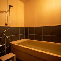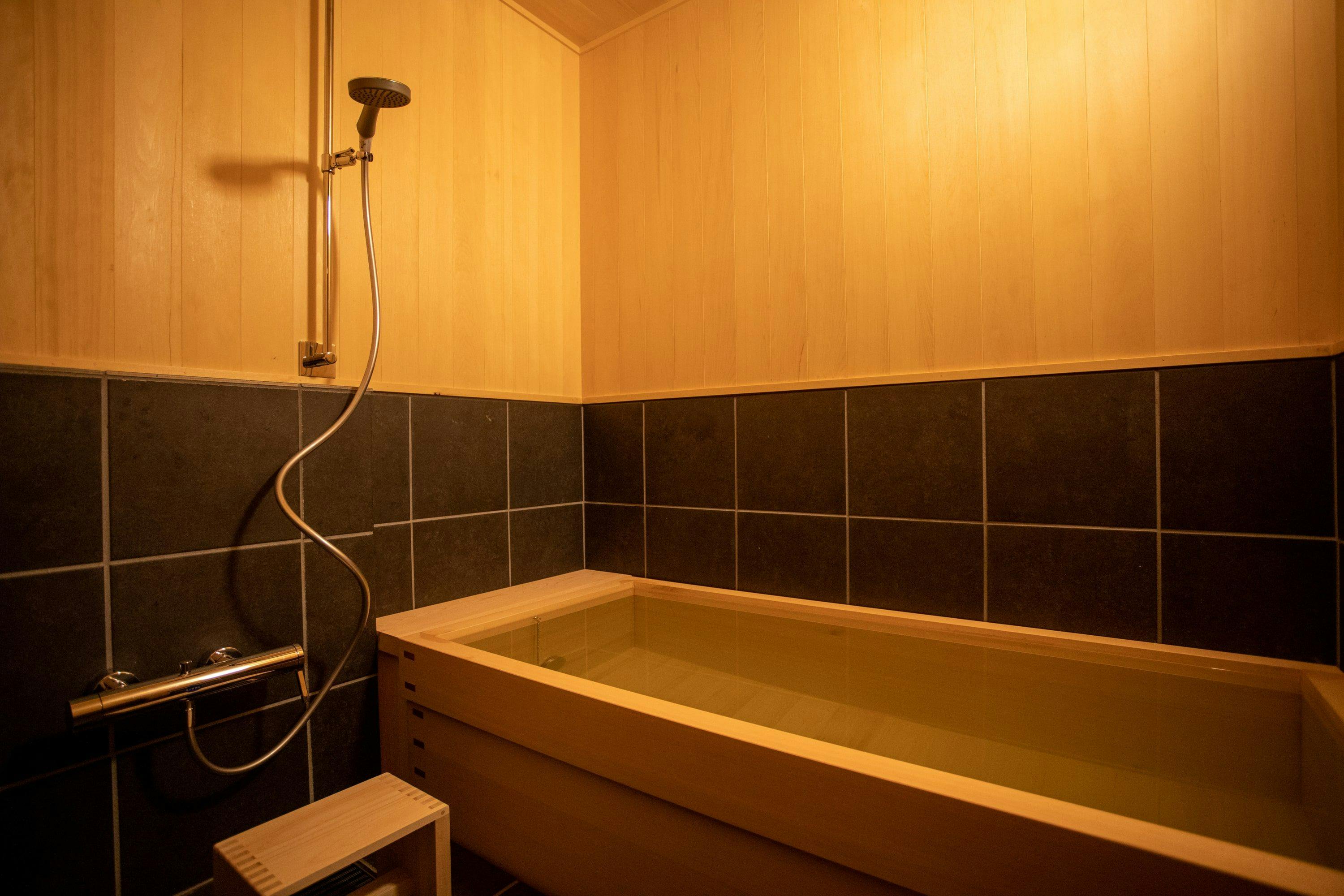 อ่างอาบน้ำทำจากไม้สนฮิโนกิแท้ในประเทศ มีขนาดกว้างขวางเพียงพอสำหรับผู้ที่มีรูปร่างใหญ่สามารถยืดขาได้อย่างสบาย เพลิดเพลินกับช่วงเวลาผ่อนคลายท่ามกลางกลิ่นหอมสดชื่นของไม้ ※ไม่ใช่น้ำพุร้อน