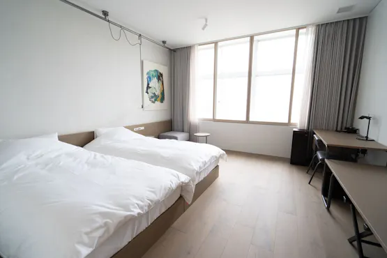 อาคารโรงเรียนประถมที่เคยเป็นส่วนหนึ่งของทิวทัศน์ชุมชนมายาวนานกว่าครึ่งศตวรรษ ท่ามกลางความงดงามสงบของชนบทแบบซาโตยามะ ยังคงรักษาเส้นสายและวัสดุเดิมไว้ พร้อมกลิ่นอายย้อนยุค ก่อนจะได้รับการปรับโฉมใหม่เป็นโอแบร์ฌ พื้นที่ที่เรียบตรงไปตรงมาและผสานงานศิลปะร่วมสมัย สร้างโลกทัศน์เฉพาะตัวของโอแบร์ฌรูปแบบใหม่ขึ้นมา