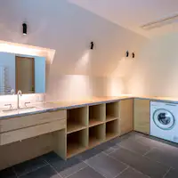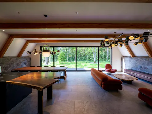 โคมไฟที่มีเอกลักษณ์ซึ่งส่องสว่างในห้องนั่งเล่นเป็นผลงานสั่งทำพิเศษโดยนักออกแบบแสงชาวอิตาลี ดิเอโก มาร์ดิกัน พร้อมด้วยตู้ไวน์ ASKO จากสวีเดน และโต๊ะรวมถึงบอร์ดทีวีสั่งทำพิเศษจาก COMPLEX เราสร้างสรรค์พื้นที่หรูหราและพิเศษที่ไม่เหมือนใคร
