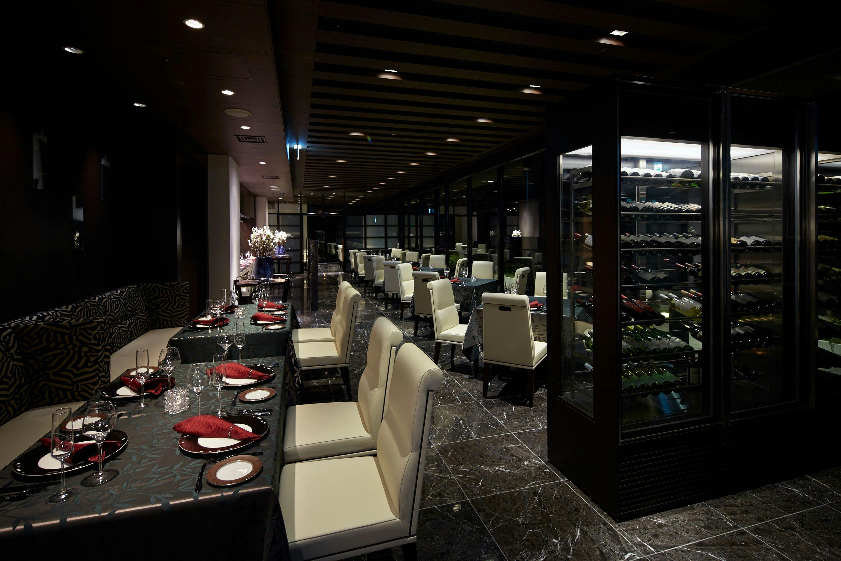 ภายในอาคารมีร้านอาหารสามแห่ง ได้แก่ กริลล์ฝรั่งเศส อาหารญี่ปุ่น และบุฟเฟ่ต์ ที่นำเสนออาหารจากภูเขาและทะเลในจานที่สวยงาม