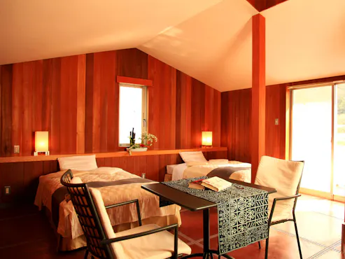 โรงแรม Onsen ตั้งอยู่บนเนินเขาที่มองเห็นทะเลญี่ปุ่น คอทเทจในที่พักมีครัวและระเบียงไม้ครบครัน หากนำวัตถุดิบมาเองสามารถเพลิดเพลินกับบาร์บีคิวได้ นอกจากนี้ยังมีโปรแกรมที่หลากหลายเพื่อเพลิดเพลินกับทะเลเกียวโต เช่น การสวมชุดกิโมโนและการตกปลาบนเรือ