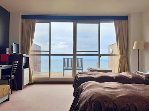 ห้องพักทุกห้องมีวิวทะเล ห้องพักแบบตะวันตกมีทั้งหมด 6 ห้อง มีขนาดหลากหลาย เช่น ห้องเดี่ยว ห้องคู่ และห้องสามเตียง ส่วนห้องพักแบบญี่ปุ่นมี 1 ห้อง ขนาดกว้าง 15 เสื่อญี่ปุ่น (ประมาณ 23 ตารางเมตร)