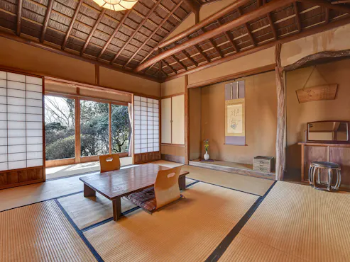 บนพื้นที่ 10,000 สึโบะ มีบ้านพักแบบโบราณแยกออกเป็น 6 หลัง ซึ่งแต่ละหลังมีลักษณะเฉพาะตัว รวมถึงบ้านที่มีหลังคามุงจากที่ให้ความรู้สึกถึงวัฒนธรรมญี่ปุ่นอย่างลึกซึ้ง เพลิดเพลินกับอาหารที่สร้างความสุขทั้งสายตาและลิ้นด้วย "ชาไคเซกิคุซูชิ" ที่จัดเตรียมอย่างพิถีพิถัน ลืมความวุ่นวายในเมืองและใช้เวลาผ่อนคลายเหมือนอยู่ในโลกของนิทานพื้นบ้านญี่ปุ่น