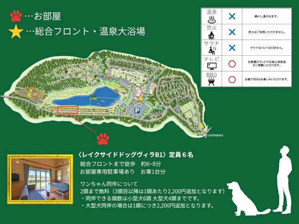 คอทเทจส่วนตัวที่ตั้งอยู่ในที่นั่งพิเศษที่มองเห็นทะเลสาบซึ่งตั้งอยู่ใจกลางสิ่งอำนวยความสะดวก ได้รับการออกแบบมาเพื่อให้ผู้ที่ไม่เคยเดินทางกับสุนัขสามารถเข้าพักได้อย่างสบายใจ โดยมีการปรับปรุงสิ่งอำนวยความสะดวกและอุปกรณ์ต่างๆ เนื่องจากเป็นห้องพักแบบคอทเทจ คุณจึงสามารถพักผ่อนได้อย่างสะดวกสบายโดยไม่ต้องกังวลกับสิ่งรอบข้างมากเกินไป ================================ 【เกี่ยวกับการเข้าพักของสุนัข】 ●จำนวนสูงสุด: ไม่จำกัดขนาด สูงสุด 6 ตัว ●ค่าธรรมเนียมการใช้สิ่งอำนวยความสะดวก: ฟรีสำหรับ 2 ตัวแรก ตั้งแต่ตัวที่ 3 เป็นต้นไป 2,200 เยน/ตัว/คืน ●ค่าธรรมเนียมการใช้สิ่งอำนวยความสะดวกสำหรับสุนัขขนาดใหญ่ (สูง 50 ซม. ขึ้นไป): 2,200 เยน/ตัว/คืน ================================ 【สิ่งอำนวยความสะดวกหลักในห้องพัก】 เตียงเดี่ยว 4 เตียง, โทรทัศน์จอแอลซีดี, ห้องอาบน้ำ, อ่างล้างหน้า, ห้องน้ำ, ตู้เย็น, เครื่องกำจัดกลิ่น, กาต้มน้ำไฟฟ้า, ไดร์เป่าผม, เครื่องปรับอากาศ 【สิ่งอำนวยความสะดวก】 ชุดนอน, ผ้าเช็ดตัวอาบน้ำ, ผ้าเช็ดมือ, รองเท้าแตะใช้แล้วทิ้ง, แชมพู, ครีมนวดผม, สบู่เหลว, คลีนซิ่ง, โลชั่น, แปรงสีฟัน, มีดโกน, แปรง, ยางรัดผม, ไดร์เป่าผม, ไฟฉาย, ร่ม 【สิ่งอำนวยความสะดวกสำหรับสัตว์เลี้ยง】 ผ้าเช็ดตัวอาบน้ำ, ผ้าเช็ดเท้า, ทิชชู่เปียก, ไม้ถูพื้น, ลูกกลิ้งกาว, แผ่นรองฉี่, ถาดรองฉี่, สเปรย์ฆ่าเชื้อและกำจัดกลิ่น, ถุงเก็บอุจจาระสำหรับเดินเล่น, น้ำยาดับกลิ่นสำหรับเดินเล่น, กรง (ลัง), เครื่องกำจัดกลิ่น, ชามอาหาร, ขนม
