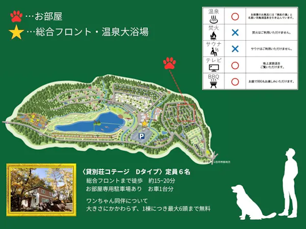 แผนที่พัก 1 คืน พร้อมอาหาร 2 มื้อ และ BBQ ในคอทเทจ ช่วงฤดูร้อน: กลางเดือนเมษายน - ประมาณเดือนตุลาคม ตัวอย่างเมนู ・เนื้อวัวฟุกุชิมะ 80 กรัม ・เนื้อหมูฟุกุชิมะ 80 กรัม ・ไส้กรอกยาคอน 1 ชิ้น ・เสียบไม้ซึคุเนะ 3 ชนิด (แครอท, หน่อไม้ฝรั่ง, หน่อไม้) 1 ไม้ ・ผัก (หน่อไม้, แครอท, พริกหยวก, ฟักทอง, หน่อไม้ฝรั่ง) ・ยากิโซบะ (เส้นบะหมี่120 กรัม, กะหล่ำปลี, ถั่วงอก และซอส) ※ปริมาณข้างต้นเป็นสำหรับหนึ่งคน ※รายการอาหารอาจเปลี่ยนแปลงตามสถานการณ์การจัดหา อาหารเย็น: "BBQ คอร์ส" ที่ห้องพักของคุณ อาหารเช้า: บุฟเฟต์ในร้านอาหารหรือกล่องมอร์นิ่ง ■จำนวนและค่าธรรมเนียมเพิ่มเติมสำหรับสุนัข■ มีข้อกำหนดเฉพาะสำหรับแต่ละคอทเทจ กรุณาดูข้อมูลรายละเอียดของแต่ละคอทเทจหรือสอบถามโดยตรงกับสิ่งอำนวยความสะดวก ※สัตว์เลี้ยงอื่นๆ เช่น แมว หรือสัตว์เล็ก สามารถเข้าพักได้ที่โดมคอทเทจ "Kawla" ■สิทธิพิเศษในการเข้าพัก สามารถใช้บริการน้ำพุร้อนธรรมชาติ "ไซโควโนะยุ" ได้ ผ้าขนหนูจะถูกเตรียมไว้ในห้องพัก หากต้องการใช้บริการก่อนเช็คอินหรือหลังเช็คเอาท์ กรุณานำผ้าขนหนูมาเอง เนื่องจากไม่มีการจัดเตรียมให้ในช่วงเวลานั้น วันธรรมดา (วันจันทร์-ศุกร์) จะไม่สามารถใช้บริการได้ระหว่างเวลา 11:00 -15:00 เนื่องจากเป็นเวลาทำความสะอาด ■แนวคิดของเรา เราคือโรงแรมรีสอร์ทรวมที่มีธีม “รีสอร์ทธรรมชาติพร้อมที่พักร่วมกับสุนัข” โดยนำเสนอสิ่งต่างๆ ที่หลากหลายเพื่อให้ทุกคนเพลิดเพลิน ไม่ว่าจะมากับคู่รัก ครอบครัว หรือแม้ไม่มีสัตว์เลี้ยงก็สามารถสนุกสนานไปกับกิจกรรมต่างๆ ได้ ■ครั้งแรกในภูมิภาคโทโฮคุ! ร้านค้า “snow peak” ภายในโรงแรม จำหน่ายสินค้าเอาท์ดอร์ยอดนิยม เช่น อุปกรณ์ตกปลา เสื้อผ้า และเครื่องประดับสำหรับสัตว์เลี้ยง นอกจากนี้ยังมีร้านกาแฟ “Snow Peak Cafe SHIRAKAWA KOGEN” ให้บริการขนมปังอบใหม่ ข้าวแกงกะหรี่สูตรเฉพาะ และชา ท่ามกลางธรรมชาติ ■น้ำพุร้อนธรรมชาติ pH9.7 พร้อมซาวน์หน้าแบบล็อกเฮาส์กลางแจ้ง น้ำพุร้อนธรรมชาติ "ไซโควโนะยุ", สระว่ายน้ำในร่มและพื้นที่สปาที่ต้องใส่ชุดว่ายน้ำ "Garden Spa" (เปิดตามฤดูกาล), รวมถึงซาวน์หน้าสไตล์ฟินแลนด์แท้ๆ ในชื่อว่า "Kaveri Sauna" ก็พร้อมให้คุณเพลิดเพลิน ■กิจกรรมหลากหลายภายในสวน ตกปลาที่ใหญ่ที่สุดแห่งหนึ่งในประเทศ มีปลาประมาณสองหมื่นตัว ว่ายวนอยู่ รวมถึงเรือแคนาเดียน จักรยานให้เช่า เทนนิส ฯลฯ สำหรับฤดูหิมะแนะนำกิจกรรมลากเลื่อนริมทะเลสาบ สนุกได้ทุกฤดู 【เวลาเช็คอิน/เช็คเอาท์】 ทั่วไป: เช็คอินเวลา 15:00 / เช็คเอาท์เวลา10:00 กลัมป์ปิ้ง : เช็คอินเวลา14:00 / เช็คเอาท์เวลา10:00 วิลลาด็อกริมทะเลสาบ & โดมคอตเทจ : เช็คอินเวล