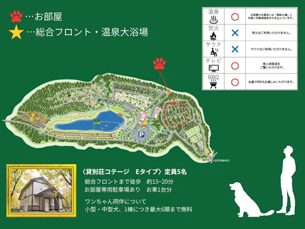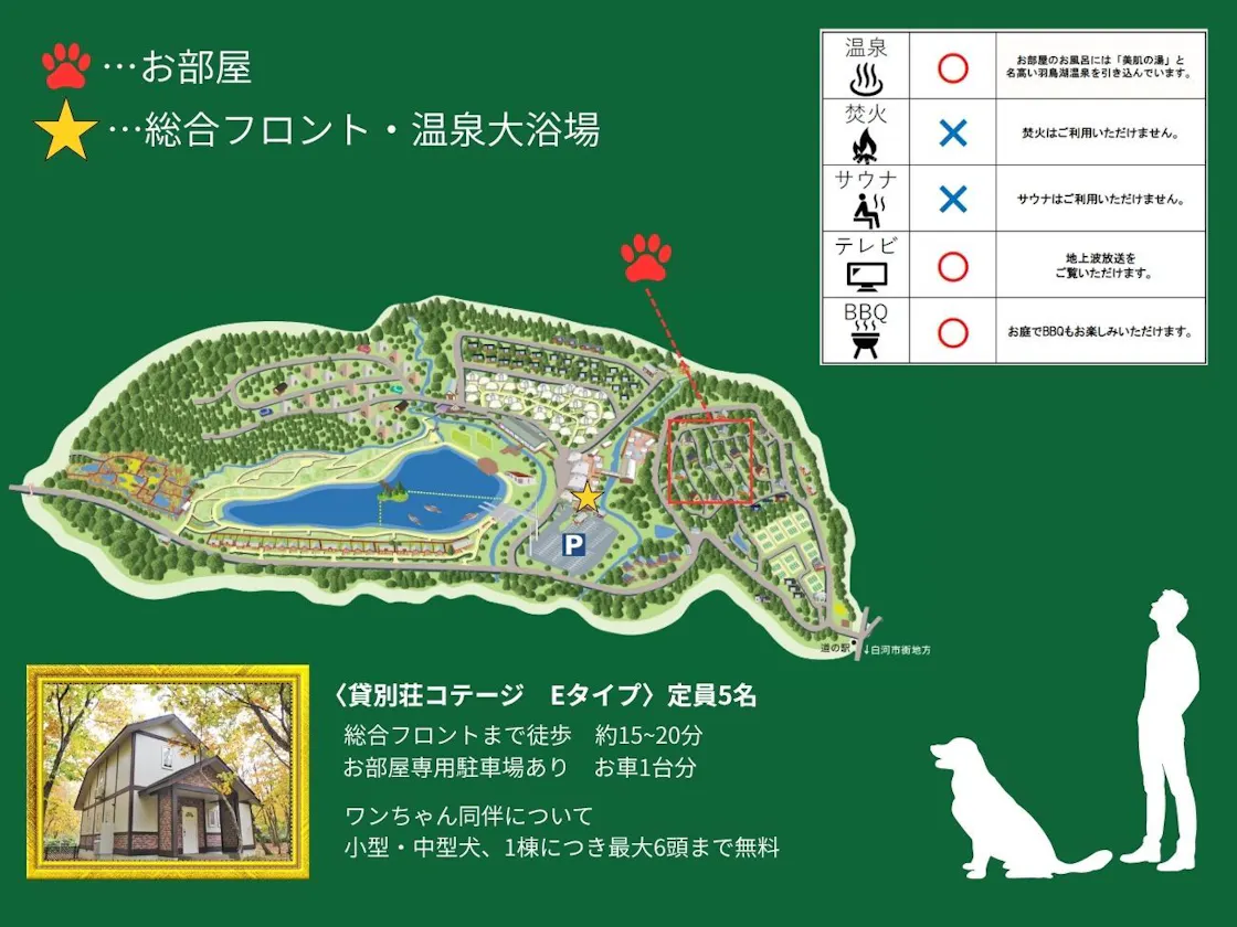 แผนที่พัก 1 คืน พร้อมอาหาร 2 มื้อ และ BBQ ในคอทเทจ ช่วงฤดูร้อน: กลางเดือนเมษายน - ประมาณเดือนตุลาคม ตัวอย่างเมนู ・เนื้อวัวฟุกุชิมะ 80 กรัม ・เนื้อหมูฟุกุชิมะ 80 กรัม ・ไส้กรอกยาคอน 1 ชิ้น ・เสียบไม้ซึคุเนะ 3 ชนิด (แครอท, หน่อไม้ฝรั่ง, หน่อไม้) 1 ไม้ ・ผัก (หน่อไม้, แครอท, พริกหยวก, ฟักทอง, หน่อไม้ฝรั่ง) ・ยากิโซบะ (เส้นบะหมี่120 กรัม, กะหล่ำปลี, ถั่วงอก และซอส) ※ปริมาณข้างต้นเป็นสำหรับหนึ่งคน ※รายการอาหารอาจเปลี่ยนแปลงตามสถานการณ์การจัดหา อาหารเย็น: "BBQ คอร์ส" ที่ห้องพักของคุณ อาหารเช้า: บุฟเฟต์ในร้านอาหารหรือกล่องมอร์นิ่ง ■จำนวนและค่าธรรมเนียมเพิ่มเติมสำหรับสุนัข■ มีข้อกำหนดเฉพาะสำหรับแต่ละคอทเทจ กรุณาดูข้อมูลรายละเอียดของแต่ละคอทเทจหรือสอบถามโดยตรงกับสิ่งอำนวยความสะดวก ※สัตว์เลี้ยงอื่นๆ เช่น แมว หรือสัตว์เล็ก สามารถเข้าพักได้ที่โดมคอทเทจ "Kawla" ■สิทธิพิเศษในการเข้าพัก สามารถใช้บริการน้ำพุร้อนธรรมชาติ "ไซโควโนะยุ" ได้ ผ้าขนหนูจะถูกเตรียมไว้ในห้องพัก หากต้องการใช้บริการก่อนเช็คอินหรือหลังเช็คเอาท์ กรุณานำผ้าขนหนูมาเอง เนื่องจากไม่มีการจัดเตรียมให้ในช่วงเวลานั้น วันธรรมดา (วันจันทร์-ศุกร์) จะไม่สามารถใช้บริการได้ระหว่างเวลา 11:00 -15:00 เนื่องจากเป็นเวลาทำความสะอาด ■แนวคิดของเรา เราคือโรงแรมรีสอร์ทรวมที่มีธีม “รีสอร์ทธรรมชาติพร้อมที่พักร่วมกับสุนัข” โดยนำเสนอสิ่งต่างๆ ที่หลากหลายเพื่อให้ทุกคนเพลิดเพลิน ไม่ว่าจะมากับคู่รัก ครอบครัว หรือแม้ไม่มีสัตว์เลี้ยงก็สามารถสนุกสนานไปกับกิจกรรมต่างๆ ได้ ■ครั้งแรกในภูมิภาคโทโฮคุ! ร้านค้า “snow peak” ภายในโรงแรม จำหน่ายสินค้าเอาท์ดอร์ยอดนิยม เช่น อุปกรณ์ตกปลา เสื้อผ้า และเครื่องประดับสำหรับสัตว์เลี้ยง นอกจากนี้ยังมีร้านกาแฟ “Snow Peak Cafe SHIRAKAWA KOGEN” ให้บริการขนมปังอบใหม่ ข้าวแกงกะหรี่สูตรเฉพาะ และชา ท่ามกลางธรรมชาติ ■น้ำพุร้อนธรรมชาติ pH9.7 พร้อมซาวน์หน้าแบบล็อกเฮาส์กลางแจ้ง น้ำพุร้อนธรรมชาติ "ไซโควโนะยุ", สระว่ายน้ำในร่มและพื้นที่สปาที่ต้องใส่ชุดว่ายน้ำ "Garden Spa" (เปิดตามฤดูกาล), รวมถึงซาวน์หน้าสไตล์ฟินแลนด์แท้ๆ ในชื่อว่า "Kaveri Sauna" ก็พร้อมให้คุณเพลิดเพลิน ■กิจกรรมหลากหลายภายในสวน ตกปลาที่ใหญ่ที่สุดแห่งหนึ่งในประเทศ มีปลาประมาณสองหมื่นตัว ว่ายวนอยู่ รวมถึงเรือแคนาเดียน จักรยานให้เช่า เทนนิส ฯลฯ สำหรับฤดูหิมะแนะนำกิจกรรมลากเลื่อนริมทะเลสาบ สนุกได้ทุกฤดู 【เวลาเช็คอิน/เช็คเอาท์】 ทั่วไป: เช็คอินเวลา 15:00 / เช็คเอาท์เวลา10:00 กลัมป์ปิ้ง : เช็คอินเวลา14:00 / เช็คเอาท์เวลา10:00 วิลลาด็อกริมทะเลสาบ & โดมคอตเทจ : เช็คอินเวล