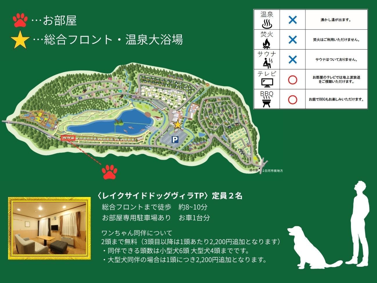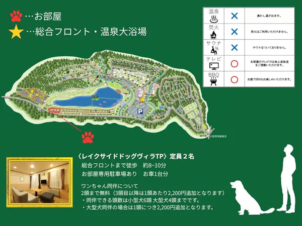 ※แผนนี้ไม่มีการจัดเตรียมอาหาร※ ■จำนวนสุนัขที่รับและค่าธรรมเนียมเพิ่มเติม■ มีข้อกำหนดสำหรับแต่ละคอทเทจ โปรดดูข้อมูลที่ระบุไว้ในประเภทห้องพัก หรือสอบถามสิ่งอำนวยความสะดวกโดยตรง ※สัตว์เลี้ยงอื่นๆ (แมวหรือสัตว์เล็ก) สามารถใช้โดมคอทเทจคาวล่าได้ ■ของขวัญเค้กวันเกิดสำหรับสุนัขที่มีวันเกิดหรือวันครบรอบในเดือนเดียวกับวันที่เข้าพัก! กรุณาระบุว่าเป็น "การเดินทางฉลองวันเกิดของสุนัข" ในระหว่างทำการจอง 【เวลาเช็คอินและเช็คเอาท์】 ปกติ: เช็คอิน 15:00 / เช็คเอาท์ 10:00 แกลมปิ้ง: เช็คอิน 14:00 / เช็คเอาท์ 10:00 เลคไซด์ด็อกวิลล่า・โดมคอทเทจ: เช็คอิน 15:00 / เช็คเอาท์ 11:00
