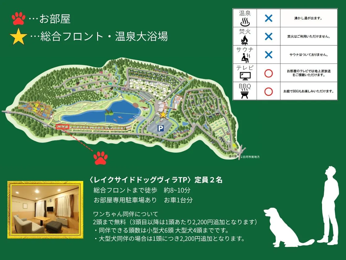 คอตเทจที่เรียงรายอยู่ในทำเลพิเศษพร้อมวิวทะเลสาบซึ่งตั้งอยู่ใจกลางพื้นที่ ได้ออกแบบสิ่งอำนวยความสะดวกและอุปกรณ์ต่าง ๆ อย่างพิถีพิถัน เพื่อให้แม้ผู้ที่ไม่เคยเดินทางพร้อมสุนัขมาก่อนก็สามารถเข้าพักได้อย่างสบายใจ ※Lake Side Dog Villa ประเภท TP ไม่ใช่อาคารเดี่ยวทั้งหมด โดยเป็นรูปแบบ 1 อาคารมี 2 ห้องพัก ※ห้องพักสำหรับ 2 ท่าน ห้องน้ำมีเฉพาะฝักบัวเท่านั้น กรุณาใช้บริการน้ำพุร้อนฮาโตริโกะภายในพื้นที่ “Saiko no Yu” (โปรดนำผ้าเช็ดตัวที่จัดไว้ในห้องพักไปด้วย) ※ห้องนอนของห้องพักสำหรับ 2 ท่าน เป็นแบบลอฟต์ ========== 【เกี่ยวกับการเข้าพักของน้องหมา】 ●จำนวนสูงสุด: ไม่จำกัดขนาด สูงสุด 6 ตัว ●ค่าบริการใช้สิ่งอำนวยความสะดวก: ฟรีถึง 2 ตัว ตั้งแต่ตัวที่ 3 เป็นต้นไป ตัวละ 2,200 เยน/คืน ●ค่าบริการใช้สิ่งอำนวยความสะดวกสำหรับสุนัขพันธุ์ใหญ่ (ส่วนสูงถึงไหล่ตั้งแต่ 50 ซม. ขึ้นไป): ตัวละ 2,200 เยน/คืน ========== 【สิ่งอำนวยความสะดวกหลักภายในห้องพัก】 เตียงเดี่ยว 2 เตียง・ทีวีจอแบน・ห้องอาบน้ำฝักบัว・อ่างล้างหน้า・สุขา・ตู้เย็น・เครื่องกำจัดกลิ่น・กาต้มน้ำไฟฟ้า・ไดร์เป่าผม・เครื่องปรับอากาศ 【ของใช้ภายในที่พัก】 ชุดนอน・ผ้าเช็ดตัวผืนใหญ่・ผ้าเช็ดมือ・รองเท้าแตะแบบใช้แล้วทิ้ง・แชมพู・ครีมนวดผม・สบู่อาบน้ำ・คลีนซิ่ง・โลชั่นบำรุงผิว (乳液) ・แปรงสีฟัน ・มีดโกนหนวด ・หวี ・ยางรัดผม ・ไดร์เป่าผม ・ไฟฉาย ・ร่ม 【ของใช้น้องหมา】 ผ้าเช็ดตัวผืนใหญ่ ・ผ้าเช็ดเท้า ・ทิชชู่เปียก ・ไม้ถูพื้น ・ลูกกลิ้งเก็บขนแบบกาว ・แผ่นรองฉี่ ・ถาดรองฉี่ ・สเปรย์ฆ่าเชื้อและดับกลิ่น ・ถุงเก็บอุจจาระสำหรับพาเดินเล่น ・น้ำยาดับกลิ่นสำหรับพาเดินเล่น ・กรง (เครต) ・เครื่องกำจัดกลิ่น ・ชามอาหาร/น้ำ · ขนม