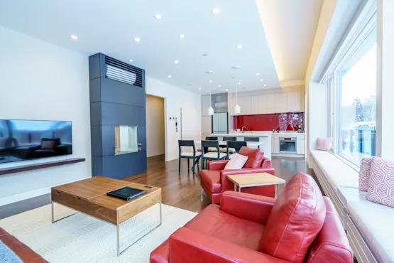 เตาผิงสมัยใหม่ที่ทันสมัย หน้าต่างบานใหญ่ที่ขยายไปจนถึงเพดานในห้องครัวและห้องนั่งเล่นให้ความรู้สึกเปิดโล่งอย่างท่วมท้น และคุณสามารถเพลิดเพลินกับทิวทัศน์ที่สวยงามของฤดูกาลต่างๆ จากห้องพักทุกห้อง ห้องครัวมีอุปกรณ์ทำอาหารครบครัน รวมถึงเครื่องซักผ้า เครื่องอบผ้า และเตารีด เหมาะสำหรับการเข้าพักระยะยาว ห้องพักทุกห้องมี 3 ห้องนอน แต่ในช่วงฤดูร้อน คุณสามารถจำกัดจำนวนห้องที่ใช้ได้ตามความต้องการ และสามารถใช้ 1 ห้องนอน (สูงสุด 2 ท่าน) และ 2 ห้องนอน (สูงสุด 4 ท่าน) ห้องนั่งเล่น ห้องครัว ห้องนอนใหญ่ และห้องนอน 1 มีเครื่องปรับอากาศ ห้องนอน 2 (ห้องนอนที่สาม) มีเครื่องปรับอากาศเพียง 4 ห้องจากทั้งหมด 8 ห้อง