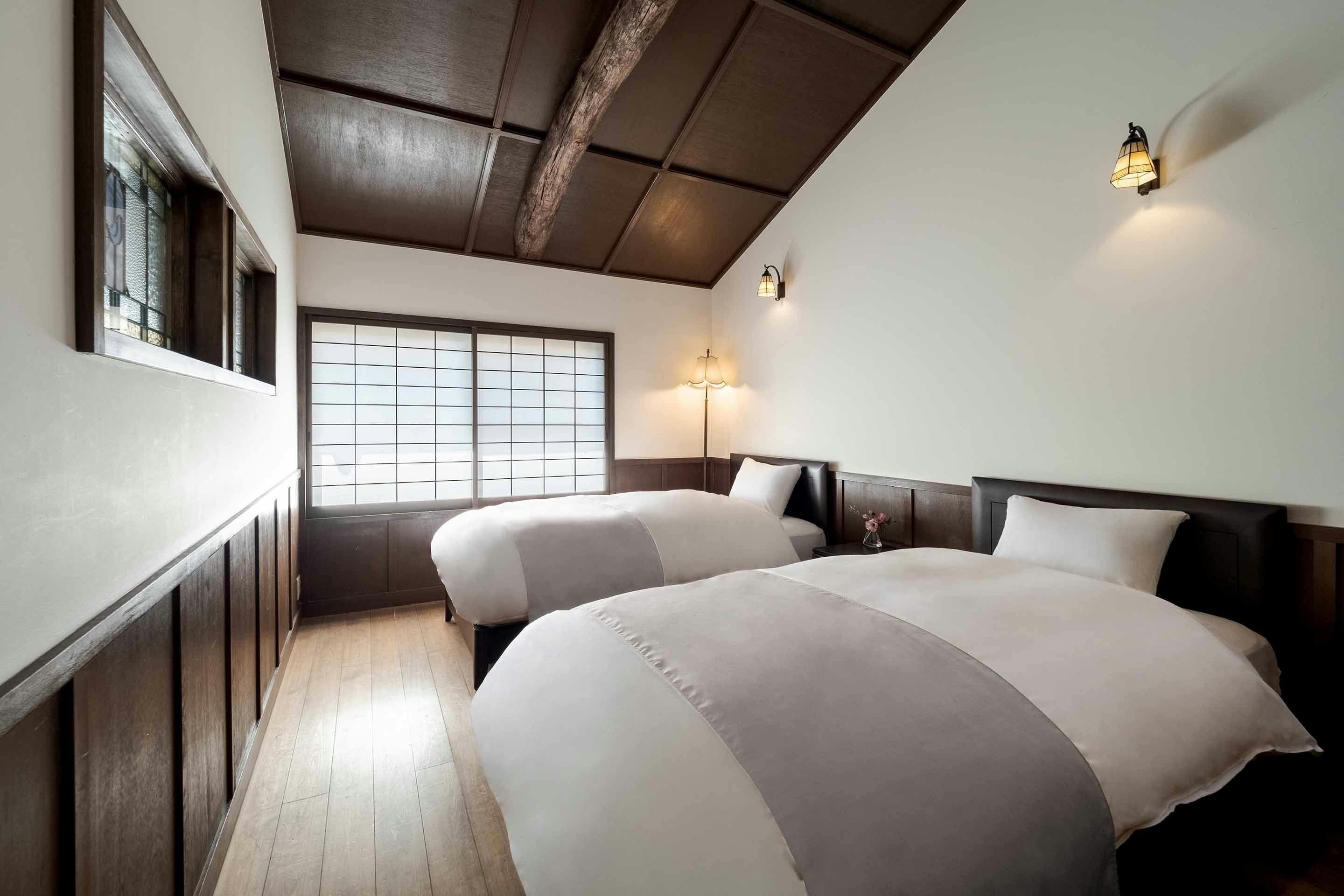 บ้านเกียวมาจิยะที่มีความเป็นเอกลักษณ์ได้รับการปรับปรุงใหม่โดยเพิ่มความสะดวกสบายและความทันสมัย พื้นที่ที่ผสมผสานระหว่างความดั้งเดิมและความทันสมัย เช่น ห้องนอนสไตล์ตะวันตกที่มีกระจกสีรูปนกพิราบ และห้องครัวที่มีเตา IH และอ่างล้างจานที่ติดตั้งในตู้ญี่ปุ่น