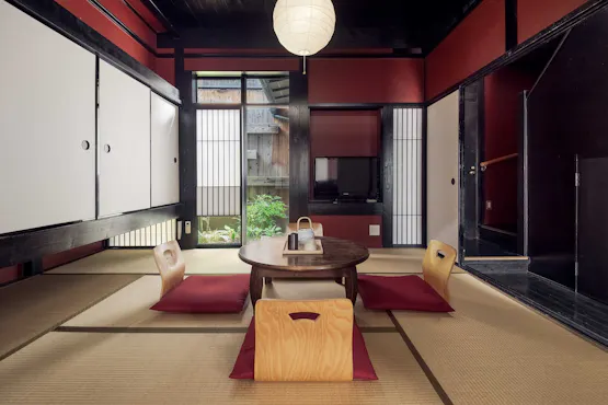 ห้องพักที่มีสีแดงเป็นหลัก แสดงอารมณ์ที่หลากหลายภายใต้แสงไฟและแสงธรรมชาติ บ้านเมืองที่ได้รับการปรับปรุงใหม่โดยยังคงความโรแมนติกในยุคไทโช พื้นที่ใช้น้ำเช่นห้องครัวได้รับการปรับปรุงใหม่ทั้งหมดเพื่อการใช้งานที่ทันสมัยและสะดวก ห้องสไตล์ตะวันตกที่มีเตียงยังคงรักษาคานของบ้านเมืองแบบดั้งเดิมไว้ ให้ความรู้สึกที่น่าสนใจ
