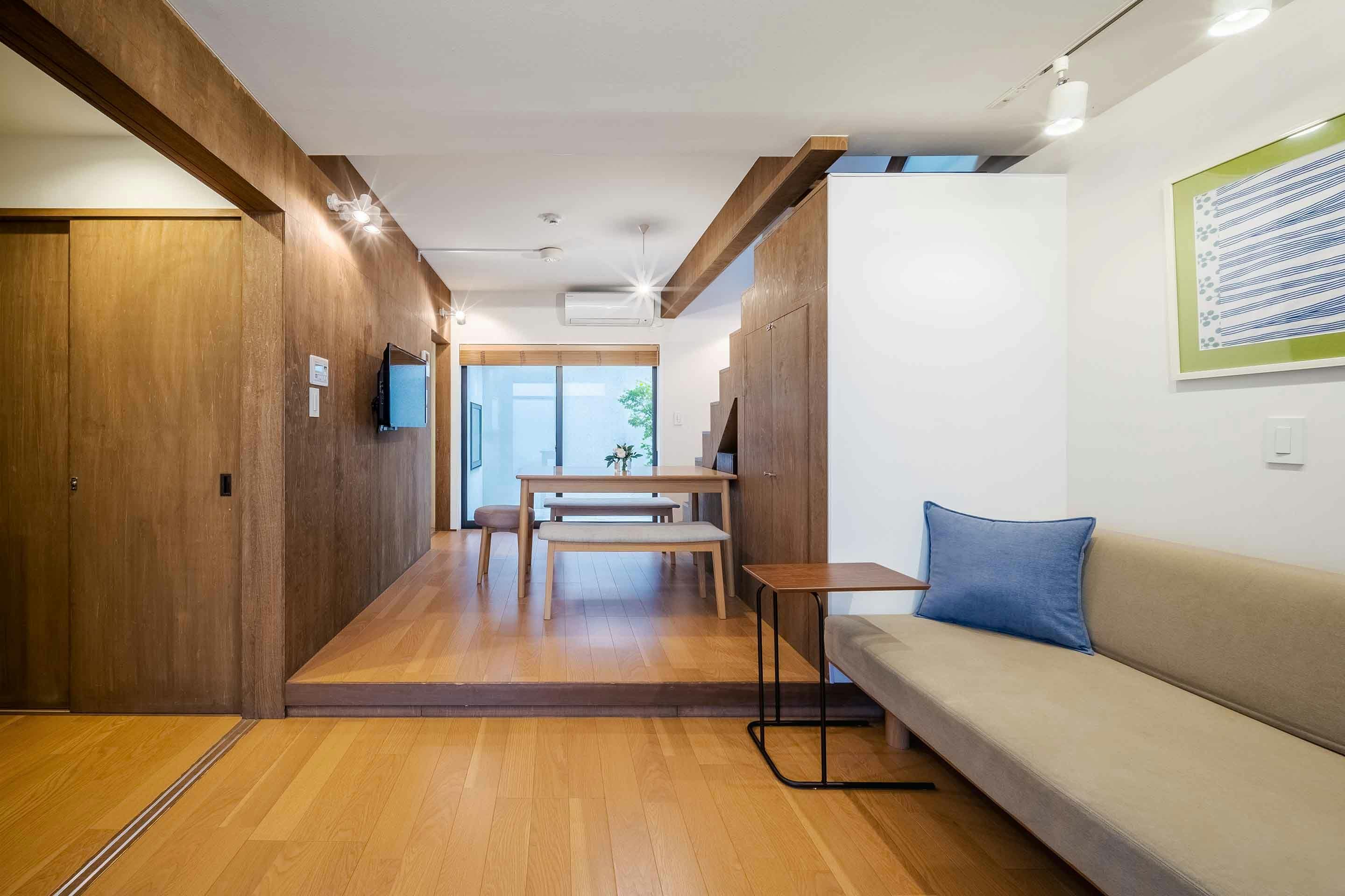 บ้านเมืองที่รับแสงได้อย่างเต็มที่ โซฟากว้างขวางและเก้าอี้ที่มีเนื้อสัมผัสอ่อนโยน พร้อมด้วยระบบทำความร้อนใต้พื้นเพื่อความอบอุ่นจากพื้นขึ้นมา โปรดสังเกตคานในห้องนอนที่สะท้อนเสน่ห์ของบ้านเมืองเกียวโต