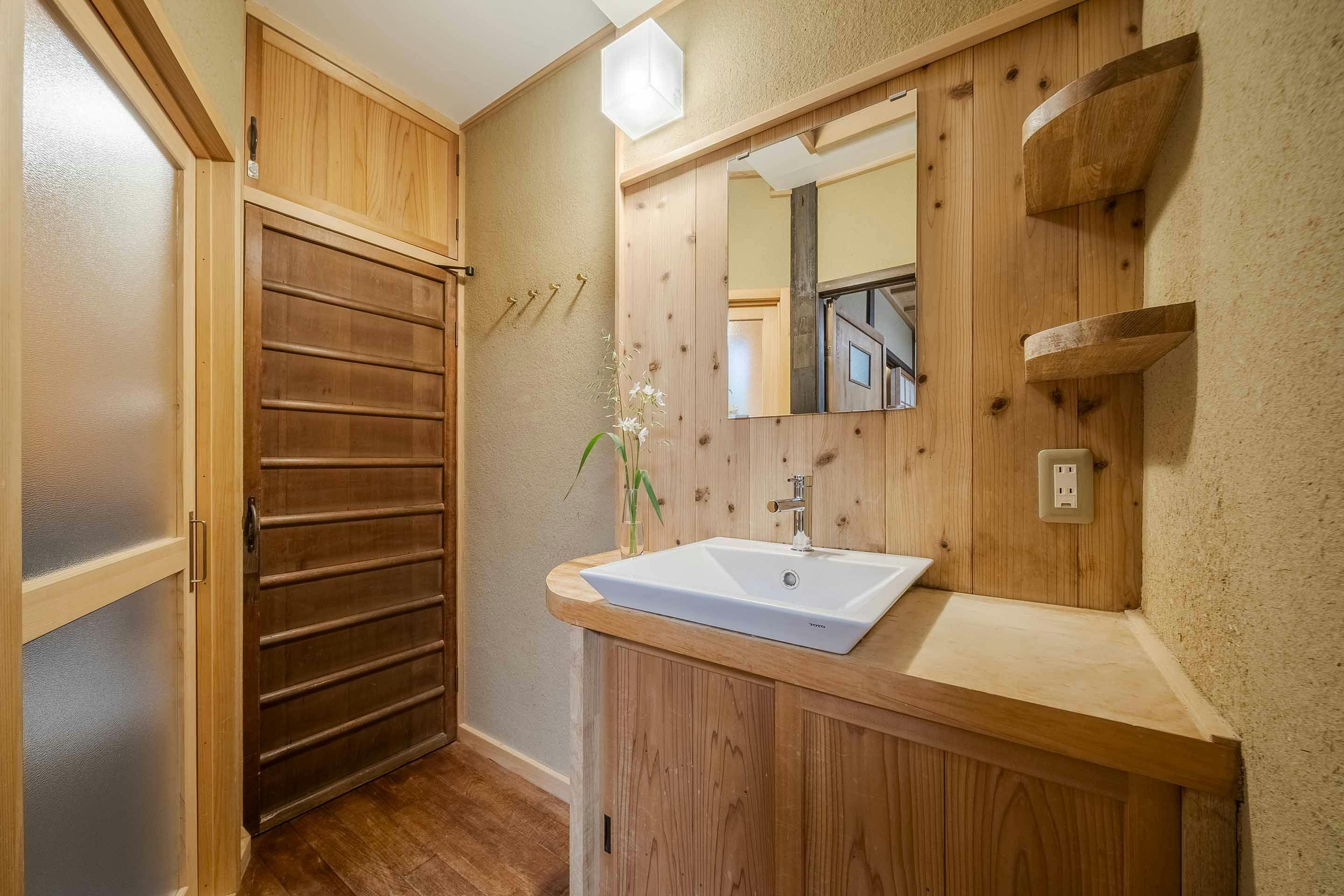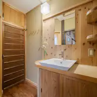 การตกแต่งภายในเลือกไม่ใช้กรอบหน้าต่างสมัยใหม่ แต่ผสานประตูกระจกกรอบไม้แบบดั้งเดิมเข้ากับบานโชจิ ผนังดินของห้องพักหลักนำดินจากผนังเก่ามาใช้ซ้ำ และฉาบปิดผิวด้วยเคียวโดะชูนูริ ให้ความสะดวกสบายและการใช้งานที่ทันสมัย พร้อมบรรยากาศอบอุ่นที่โอบล้อมด้วยผนังดินและไม้