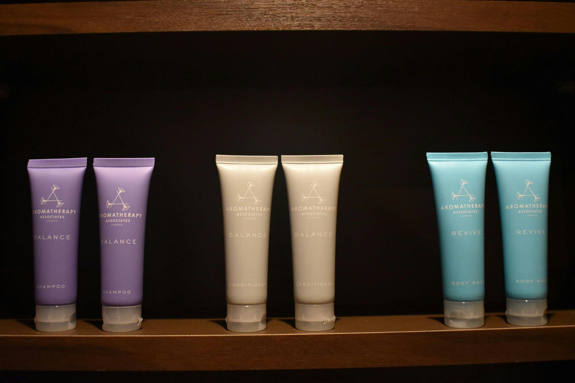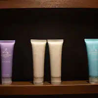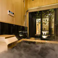 เมื่อเข้าสู่ห้องน้ำ คุณจะสัมผัสได้ถึงกลิ่นหอมอ่อนๆ ของไม้ฮิโนกิ อ่างอาบน้ำมีขนาดกว้างขวางพอสำหรับผู้ใหญ่สองคน สำหรับคนเดียวจะรู้สึกถึงความโล่งโปร่งและผ่อนคลาย จากห้องน้ำสามารถมองเห็นสวนเล็กๆ ที่ตกแต่งด้วยป่าไผ่ โคมไฟหิน และใบเมเปิ้ล สร้างบรรยากาศของเกียวโต สวนเล็กๆ นี้เป็นสัญลักษณ์ที่สะท้อนถึงทิวทัศน์ที่โดดเด่นของเกียวโต