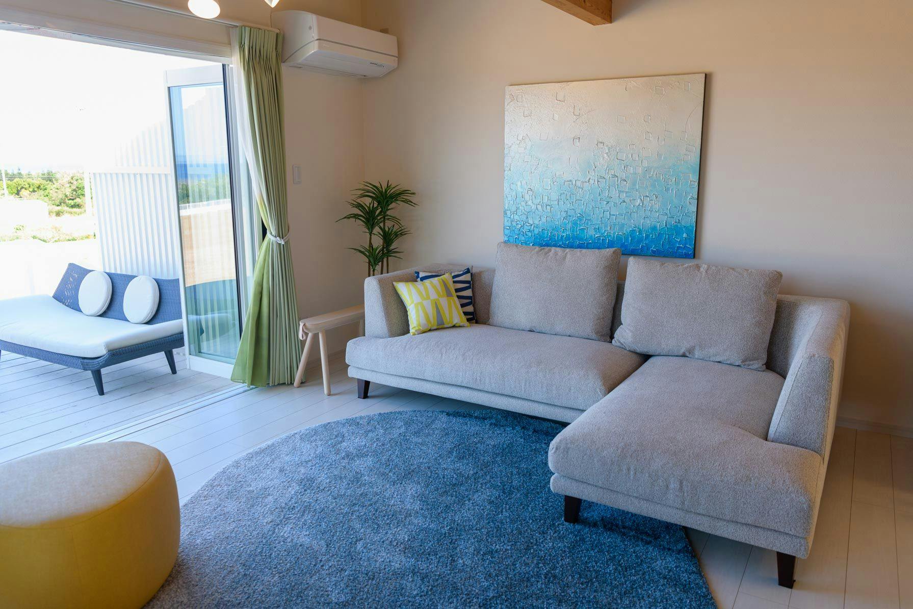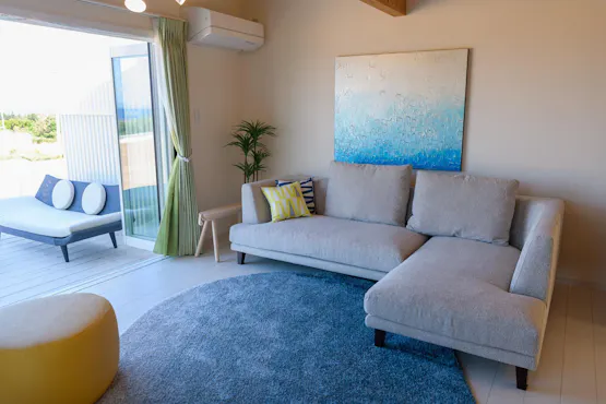 พื้นที่ห้องนั่งเล่นที่สะดวกสบายสำหรับครอบครัวทั้งหมด เมื่อเปิดหน้าต่างจะพบโซฟาบนดาดฟ้าไม้ เพลิดเพลินกับการพักผ่อนพร้อมชมวิวทะเลอิชิกากิ