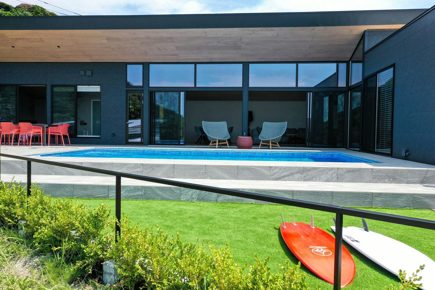 ばび 5/10/2025We stayed with 5 adults and 4 children. Both the kids and adults were thrilled! The spacious living room with a large TV allowed us to relax and enjoy YouTube and Netflix at our leisure. The kitchen, equipped with the latest appliances, made cooking fun, and the clear instructions provided made everything easy to use. The only minor issue was that the remote control for the ceiling window had no batteries, so we couldn't open or close it. There were comfortable beds by the poolside for lounging, and since you can see outside clearly from the living-dining-kitchen area (LDK), it was easy to keep an eye on the kids in the pool from anywhere. The sauna with a löyly feature was also fantastic! We would love to stay here again. Highly recommended for friends as well!