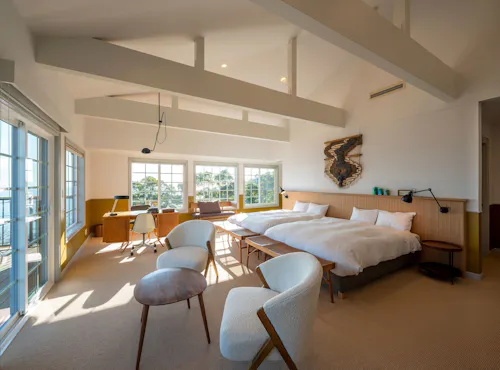 ทุกห้องพักมีวิวทะเลที่งดงาม และสามารถเพลิดเพลินกับการแช่น้ำอุ่นอย่างผ่อนคลายราวกับหลอมรวมไปกับอ่าวซางามิที่อยู่ตรงหน้า