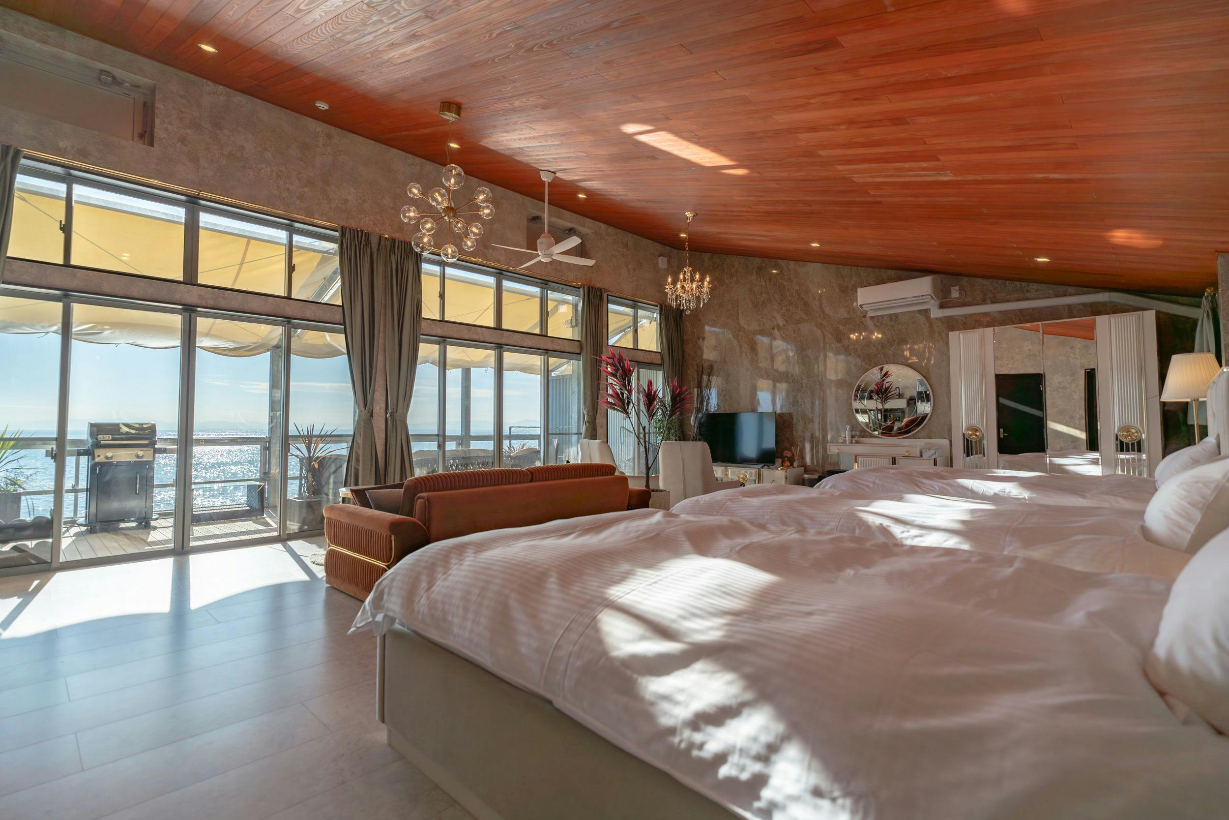 ห้องพักส่วนตัวทั้ง 9 ห้องปิดกั้นลมทะเลจากภายนอกอย่างสมบูรณ์ ให้คุณเพลิดเพลินกับการผสมผสานที่หรูหราของพระอาทิตย์ตกและทะเลจากภายใน เฟอร์นิเจอร์ภายในหลายชิ้น เช่น โคมไฟระย้า โซฟา เตียง ถูกนำเข้าจากอิสตันบูล ประเทศตุรกี ซึ่งเป็นประเทศที่ติดกับทะเลเมดิเตอร์เรเนียนและทะเลอีเจียน ด้วยการตกแต่งภายในที่หรูหราด้วยสีขาวและทอง เพลิดเพลินกับช่วงเวลาที่ไม่ธรรมดา