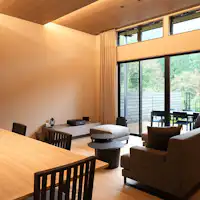 1 วันรับเพียง 5 กลุ่มเท่านั้น วิลล่าแบบแยกส่วนที่ตั้งอยู่ท่ามกลางธรรมชาติอันอุดมสมบูรณ์ของอาโสะ พร้อมน้ำพุร้อนธรรมชาติและซาวน่าส่วนตัวในทุกห้องพัก ระเบียงเชื่อมต่อกับป่าไม้และห้องอาบน้ำที่สามารถชมวิวสีเขียวได้ เพลิดเพลินไปกับเสียงใบไม้ไหว เสียงนกร้อง และเปลวไฟที่พลิ้วไหว ใช้เวลาผ่อนคลายในห้องพักกว้างขวางพร้อมฟังเสียงแห่งธรรมชาติ